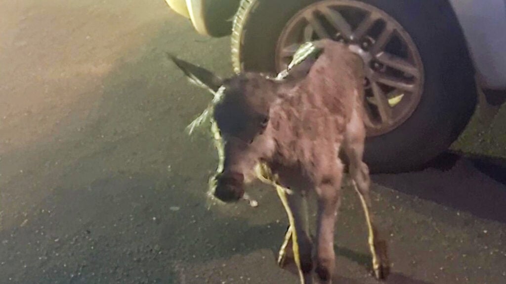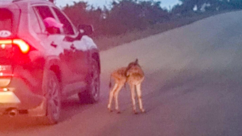 Without its mother, or the rest of the herd, this poor baby must have felt extremely exposed and vulnerable, which would help explain why it clung so fiercely to the car and refused to leave its side, even when it started to pull away.