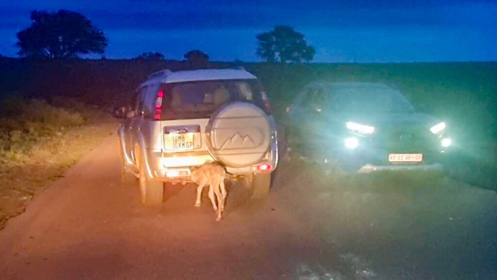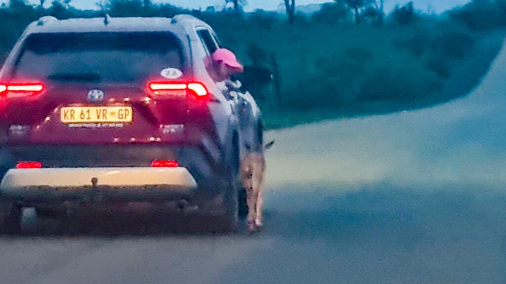 No doubt hungry, the little wildebeest tried all down the length of the car, and even when it became clear it wasn’t going to find anything, it kept trying, just to be sure. The whereabouts of its real mother remained unknown throughout the footage.