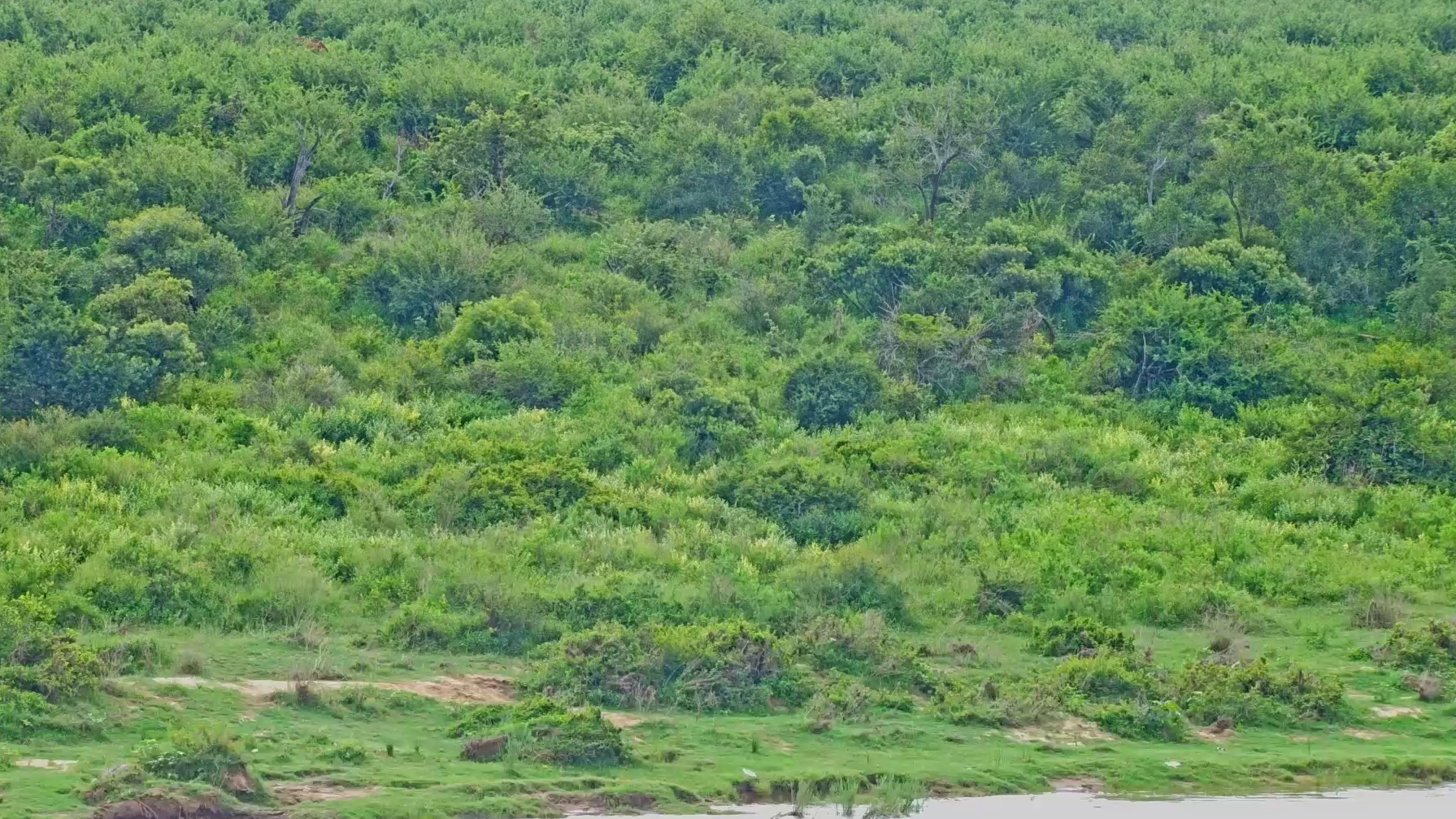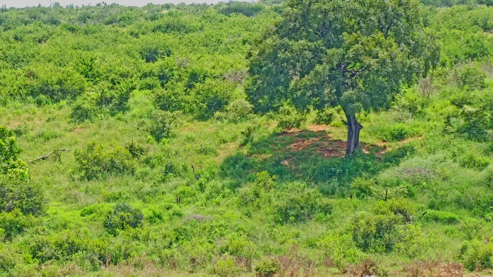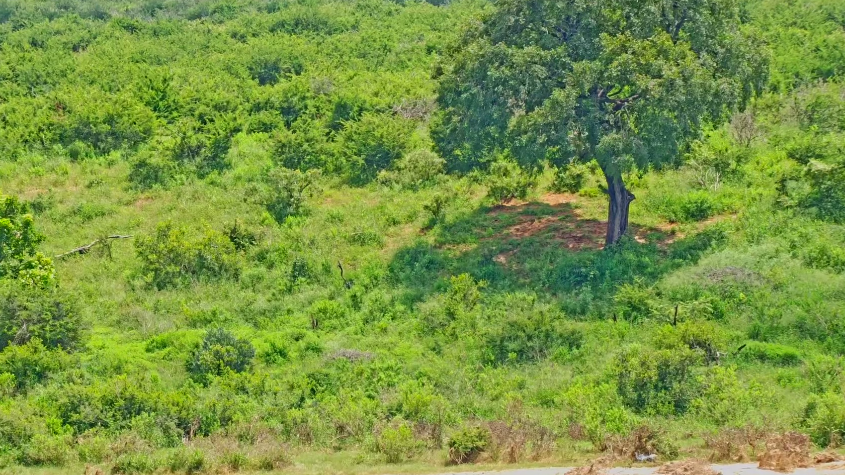 Reveal: An impala munches safely recessed behind the big tree, right side. A shrubby screen and dappled light render it near invisible, but Ting Vision pierces the veil effortlessly!