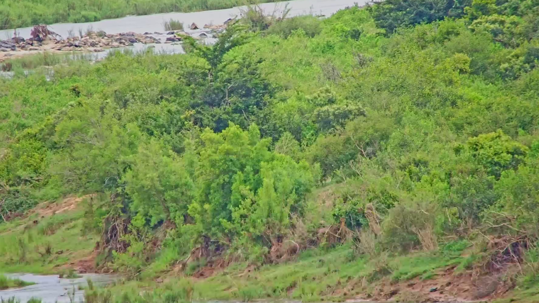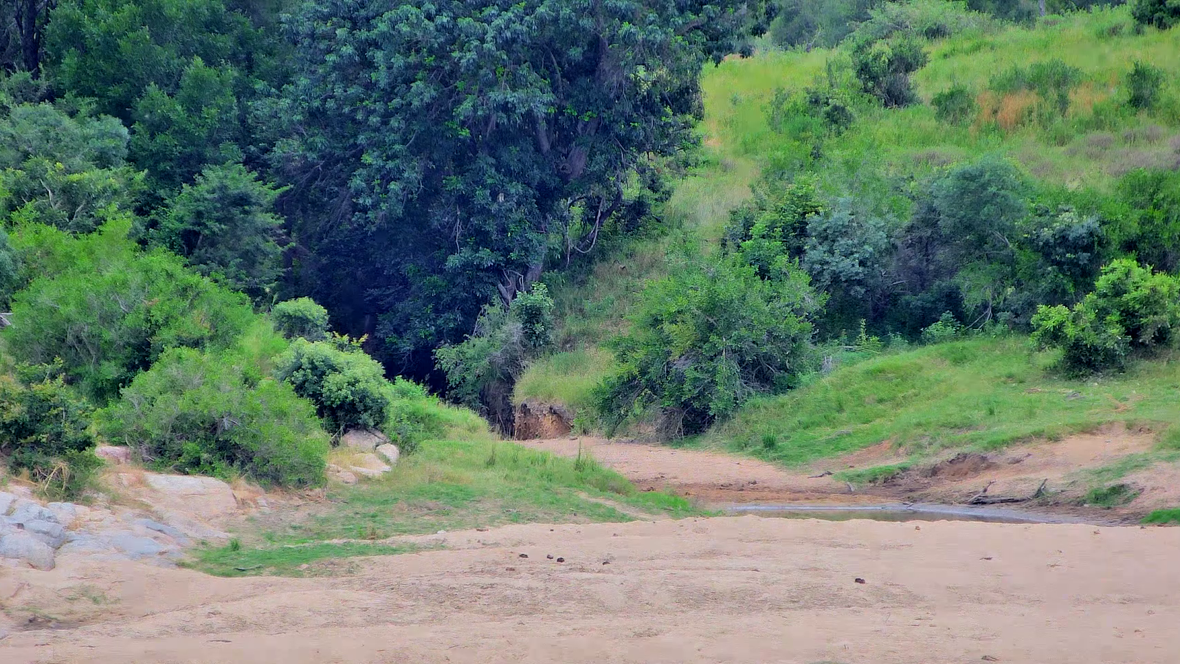 South Post at Kruger delivers a dramatic gully plunging to sand, flanked by scrubby slopes and dark tree clumps at the rear. There are so many perfect hiding spots, where could the animal be?