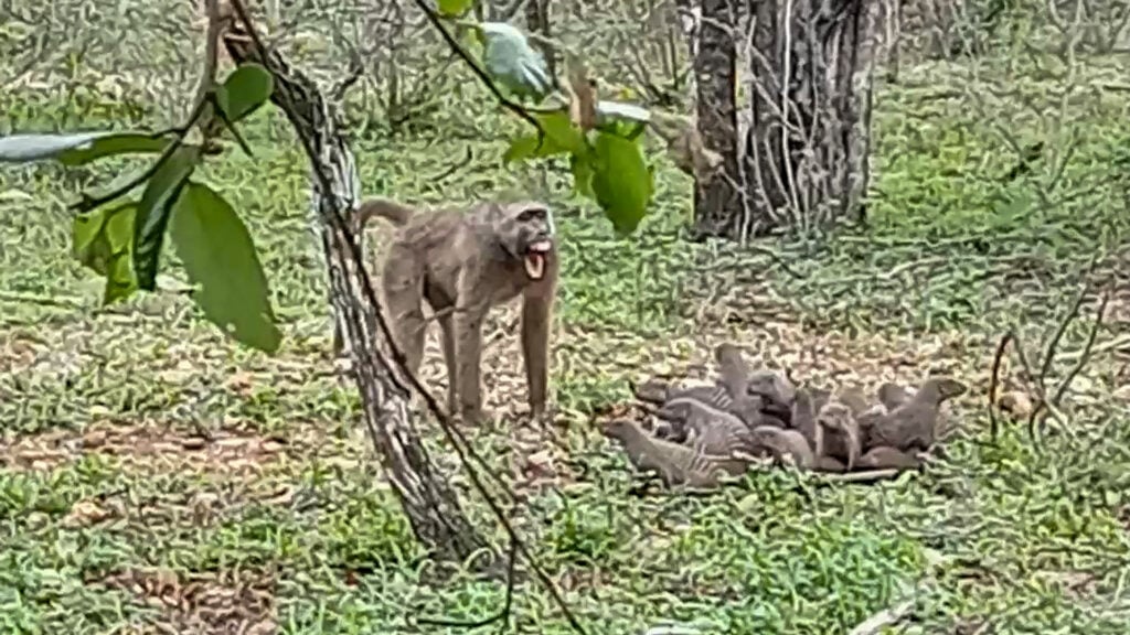 Charmaine recounted that she was in the midst of enjoying the beautiful nature when all of a sudden, she noticed a baboon dashing by with a dead mongoose in its grip! Seconds later, another primate appeared and was chasing at the remaining group of mongooses!