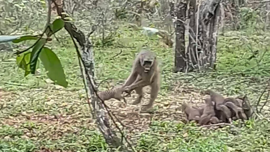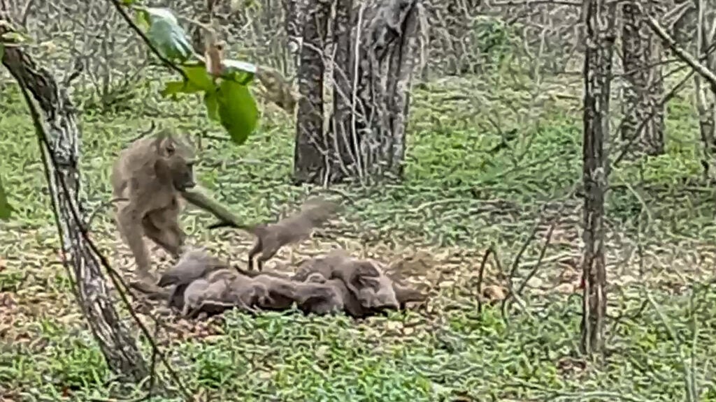 Baboons leverage smarts and brawn to hunt small animals, succeeding by surprise or splitting groups. Here, the mongooses’ teamwork prevailed, echoing tactics seen in meerkats or suricates, where collective defence doubles the pup’s survival odds against larger predators.