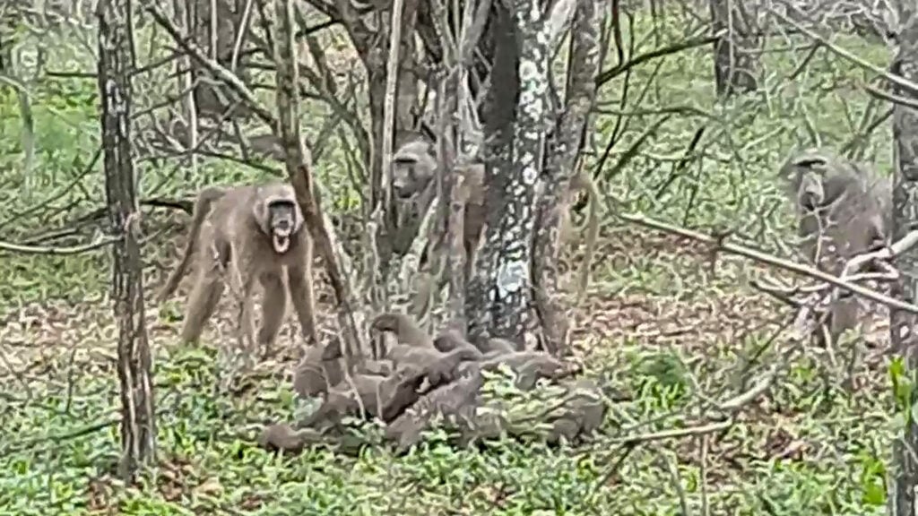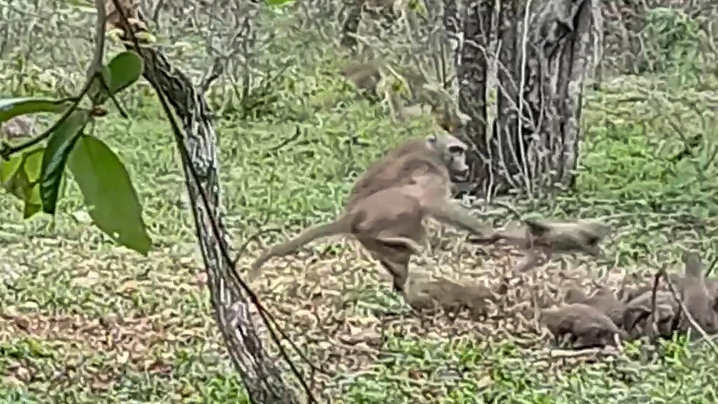 In this wildlife hotspot near Kruger, baboons often attempt raids for easy protein, eyeing small mammals when chances arise. In this situation, it appeared as though the second baboon saw its friend’s success and wanted to secure a meal for itself.