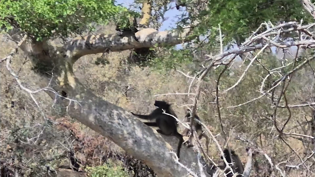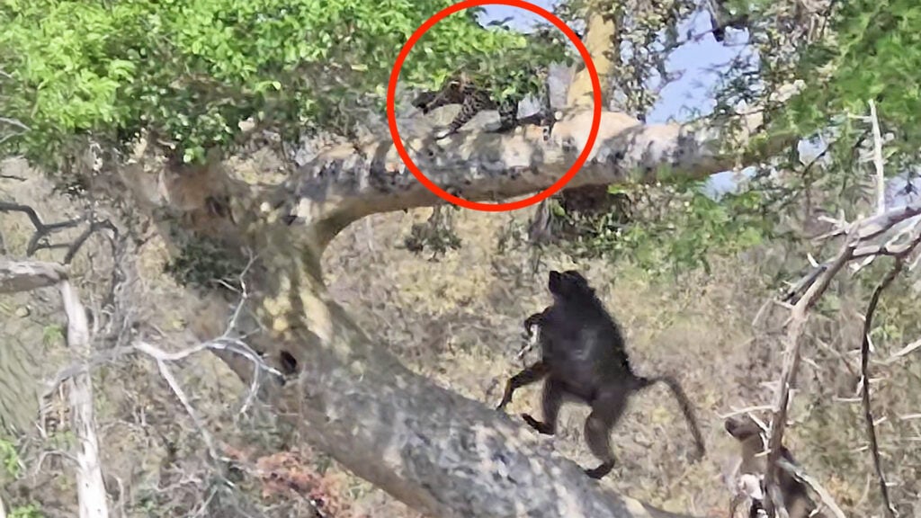As soon as they realized that the leopard was retreating, the emboldened baboons hurried higher up the tree, making sure to harass it at every step of the way. The leopard turning its back was a risky move, but other than continually trying to yank its tail the baboons let it leave in peace.