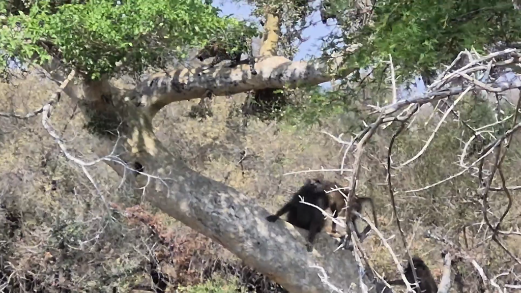 With the lower branches of the tree conquered, the baboons were braver in their movements, but even then they were unable to force the leopard to vacate the tree completely. This resulted in an uneasy stalemate that went on for an unknown period of time.