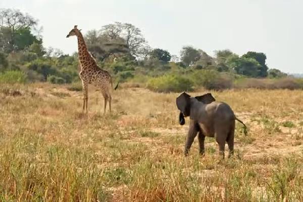 Baby elephant sees giraffe in the distance