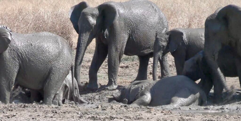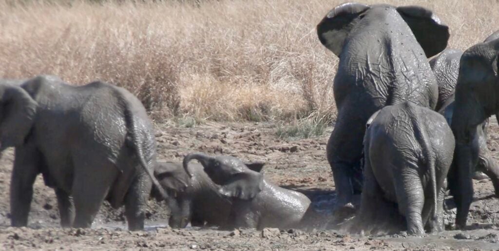Eventually, the family moved a few meters over to a new mud hole, and the young elephants quickly forgot about their imaginary enemies. What followed was a scene of pure joy.