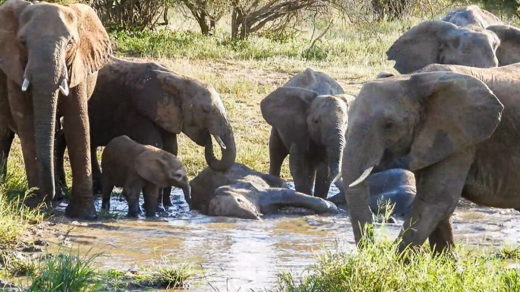 The sighting was filmed by Mark Fox of Foxy’s on Safari in Kruger National Park, where a large herd of elephants, between 10 and 20 individuals, had gathered at a small waterhole. Some elephants splashed themselves with water to cool down, others lay in the puddle for a full-body mud bath and several juveniles tumbled and rolled as if the waterhole were their private playground.