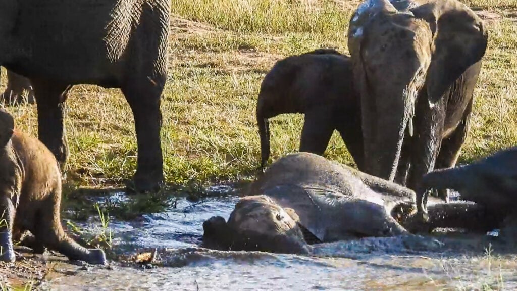 In this sighting, the calf appeared to be stuck, unable to push itself upright despite repeated attempts. The mother and two other young elephants clustered close, their trunks reaching, feet shifting nervously as though ready to intervene.