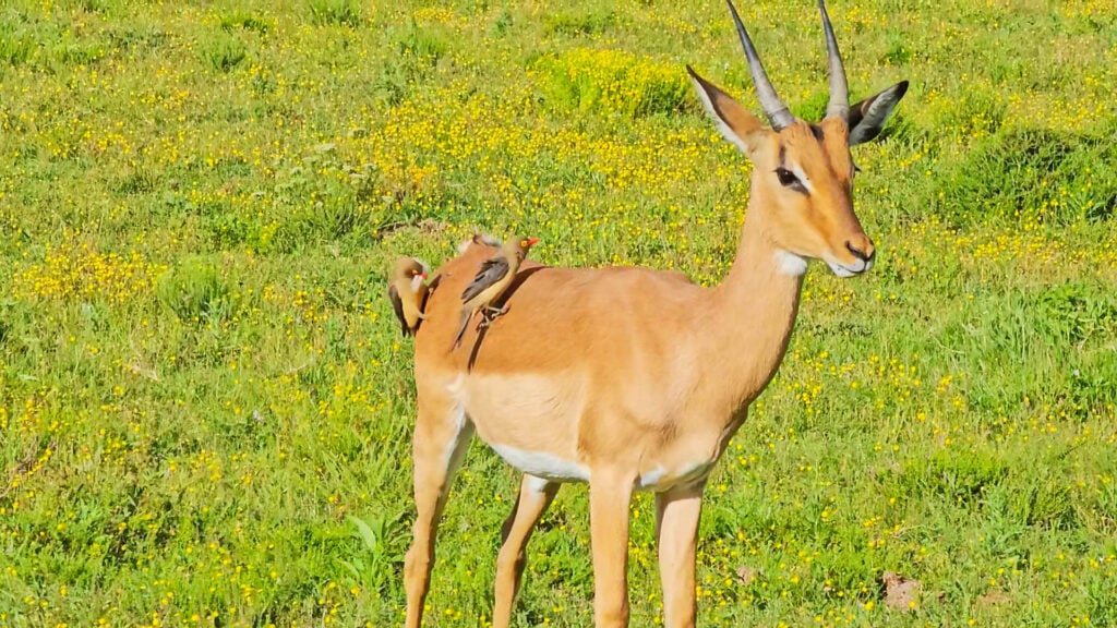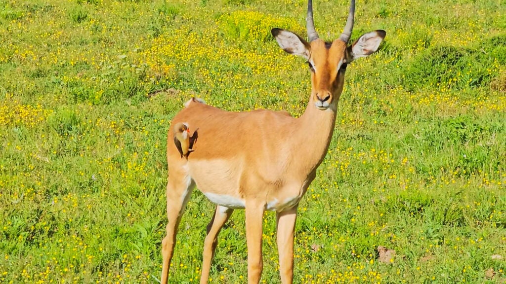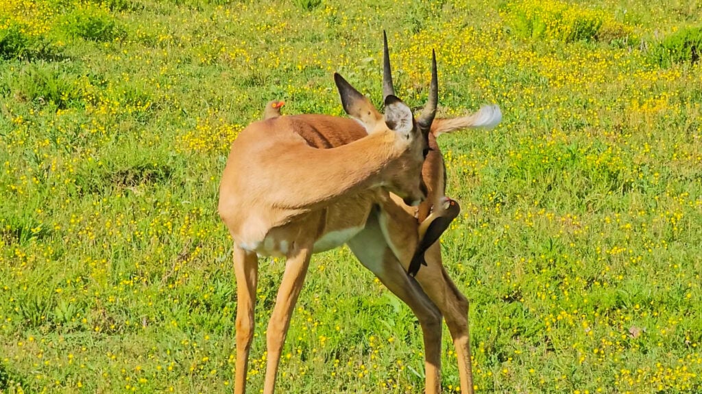 Usually, oxpeckers and impalas have a symbiotic relationship where both benefit. However, in this case, it appeared slightly parasitic since the impala was losing hair without any apparent gain!