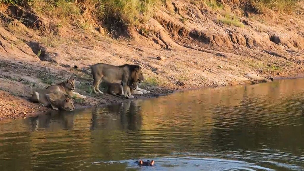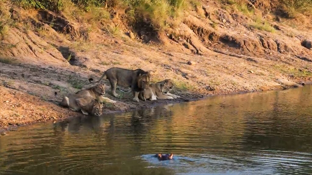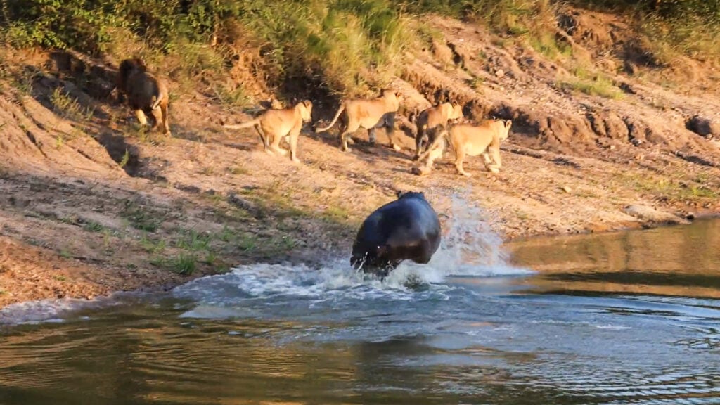 One thing was for certain, the lions were definitely going to keep their distance, as a second hippo made its presence known to help the first in deterring them, and the risks of approaching the water became far too great.