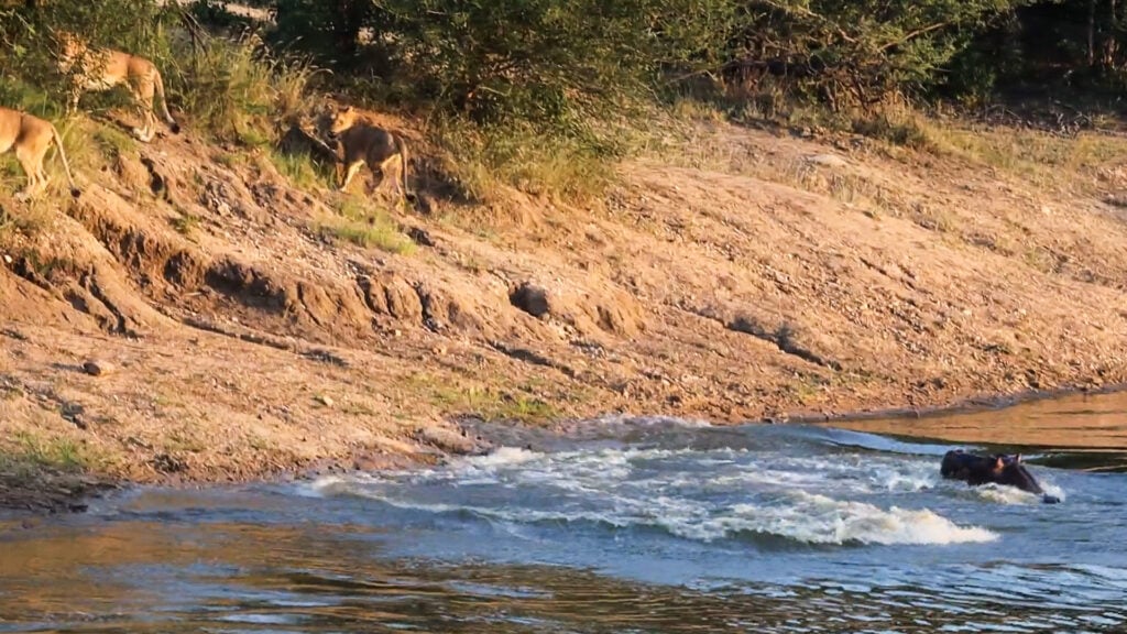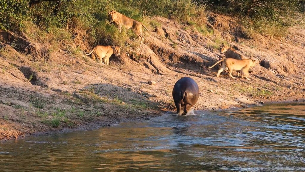 The lions would have been more than capable of outrunning the hippo if the situation had demanded it, and they didn’t retreat too far. They moved back to a safe distance, ready to flee further if the hippo pursued them, but otherwise held their ground.