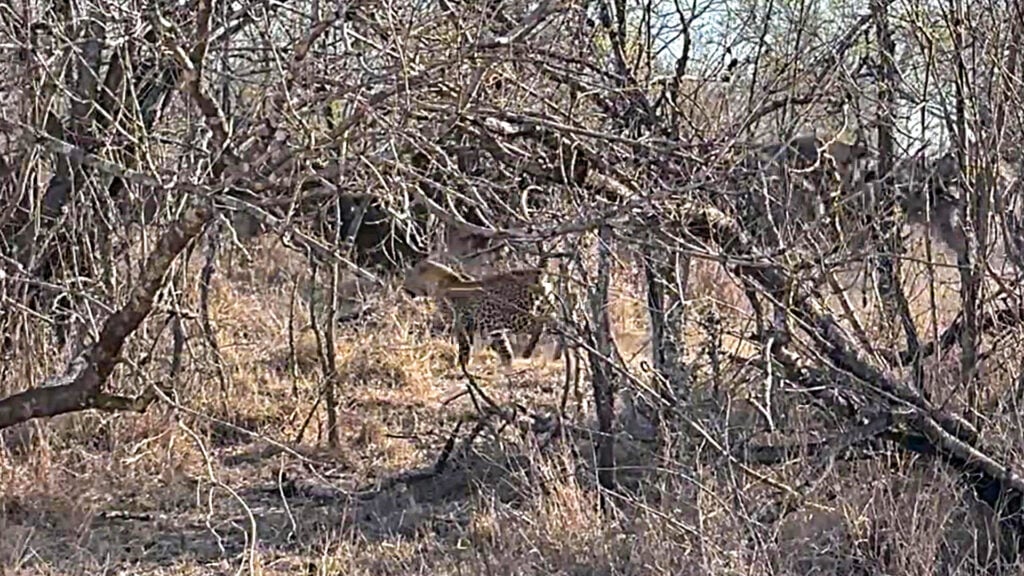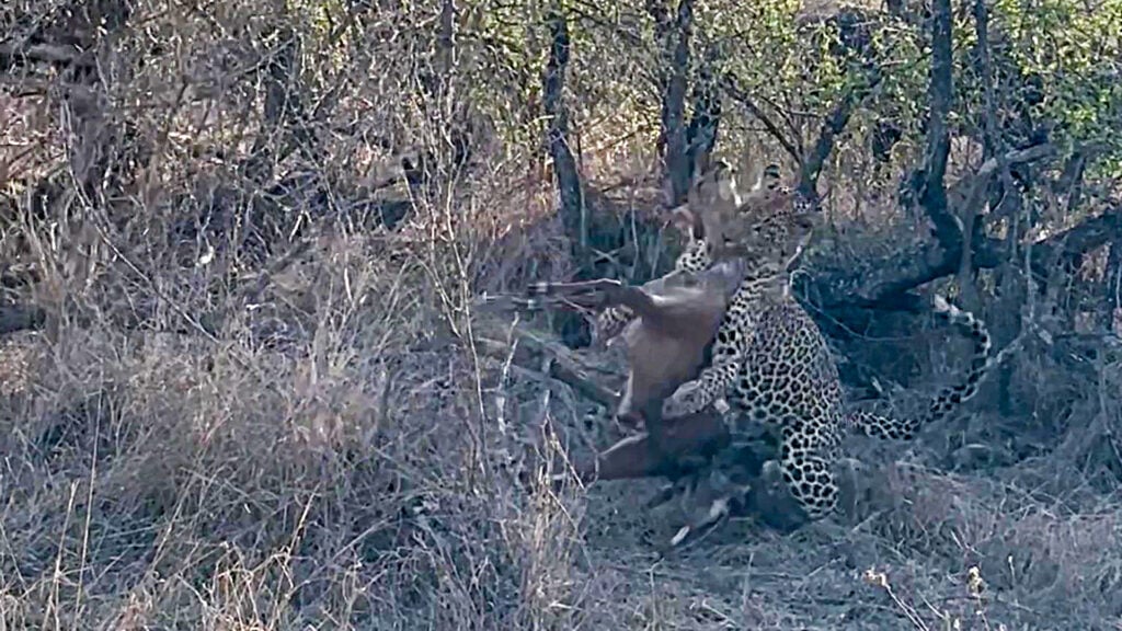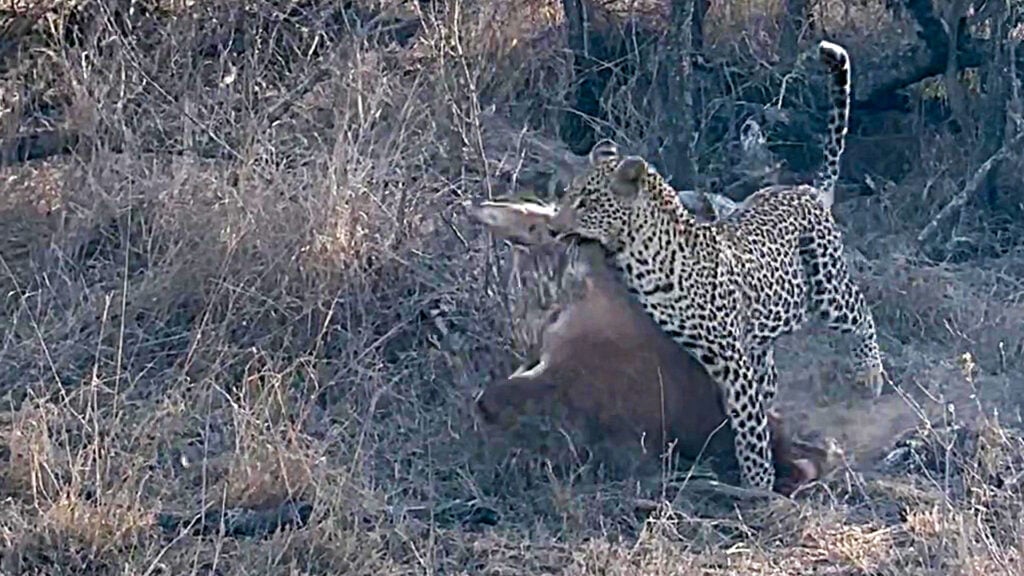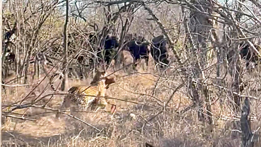 The leopard had just made a kill when it encountered the herd along its path through the thick bushveld terrain.