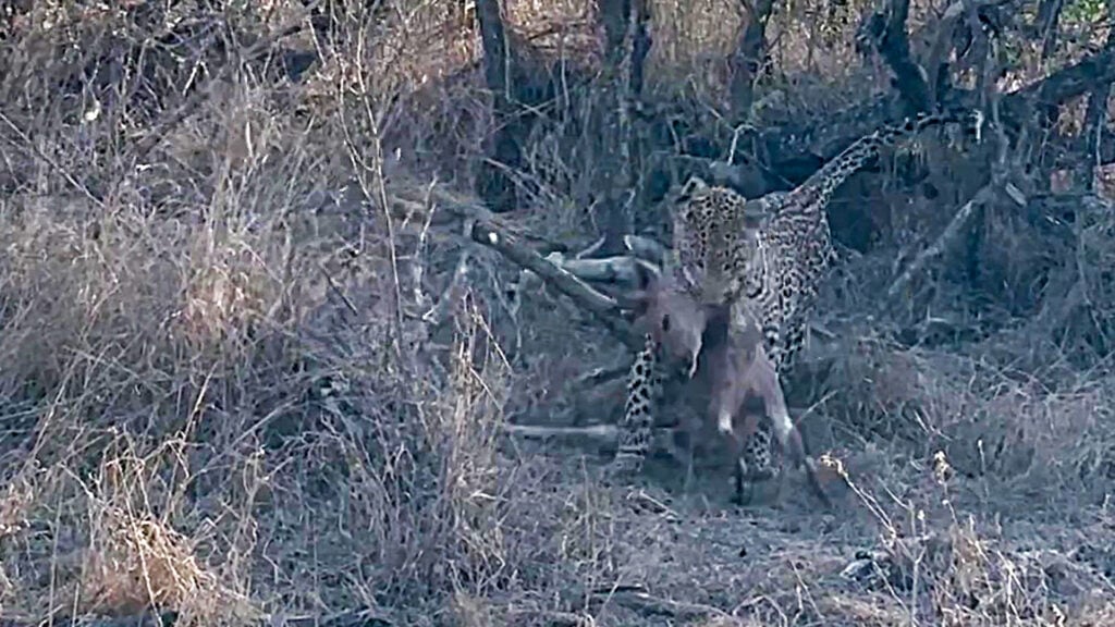 The leopard was on a mission to find a suitable location to settle and enjoy the spoils of its successful hunting endeavor. For this apex predator, this meant settling in the branches of a tree, away from the threat of animals on the ground.