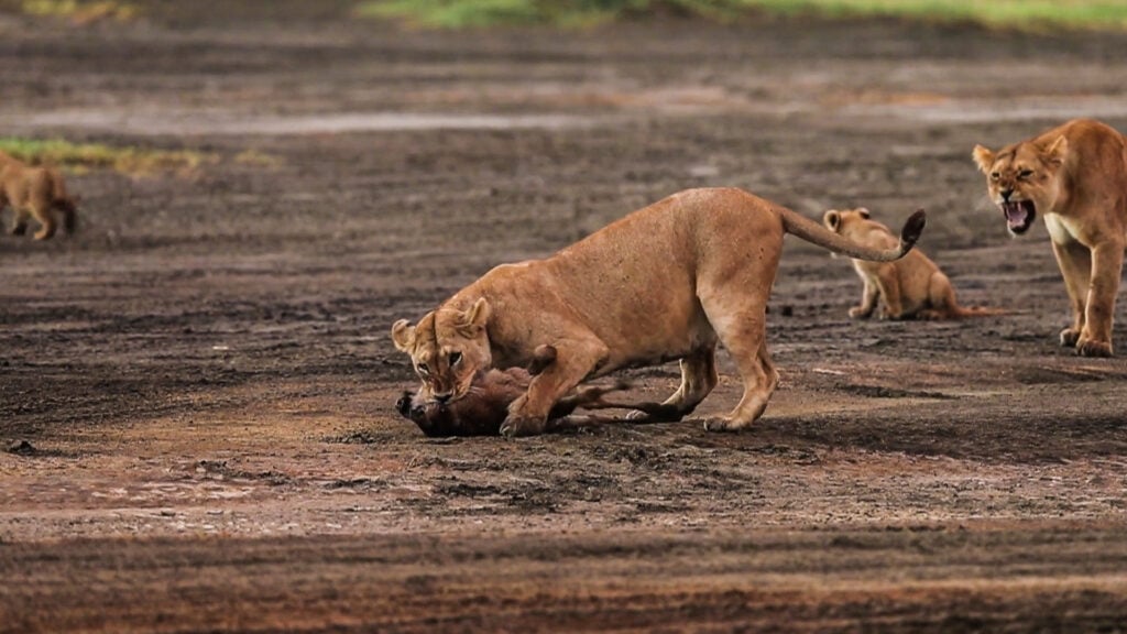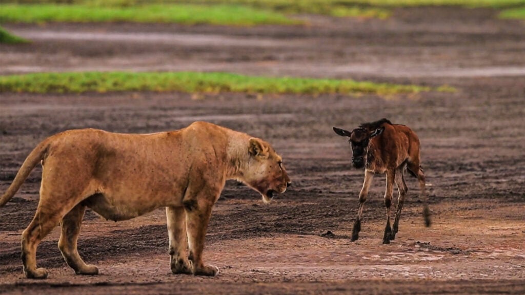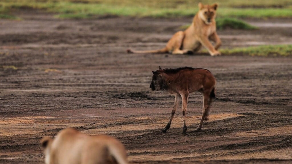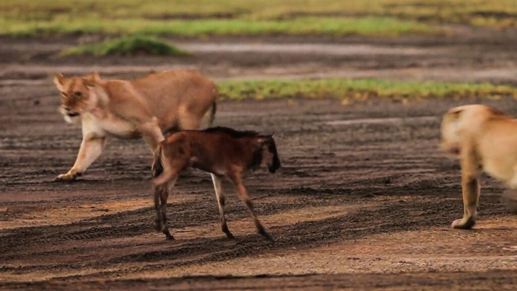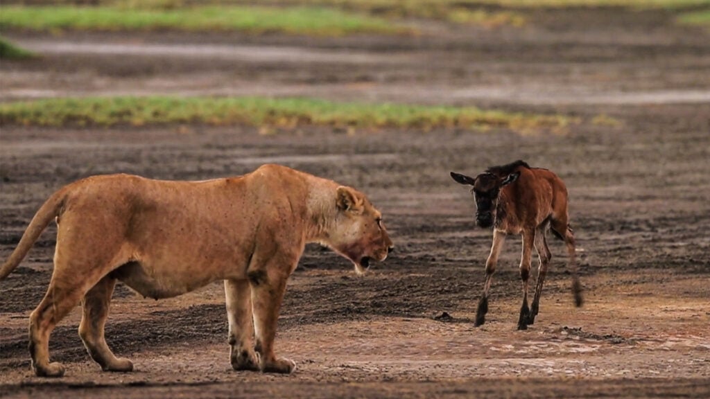 As the lioness walks off with its limp prize, the wildebeest’s life is over before it had really started. And it will be one of many, as the predators of the area take advantage of the seasonal glut of food.