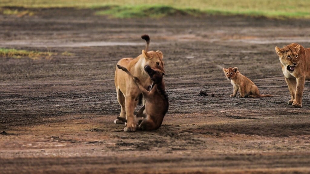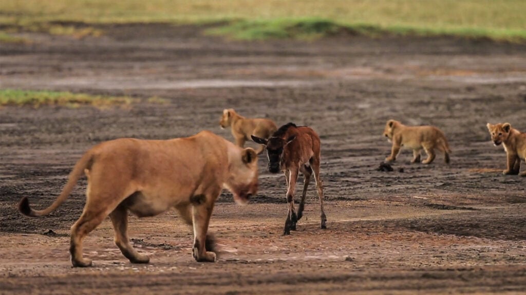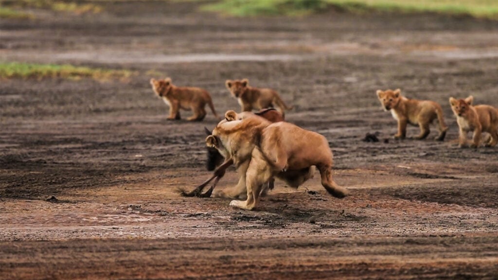 Surprisingly, at first the lions appear uninterested. Although they’re well aware of the wildebeest, even the passing cubs show only a passing interest.