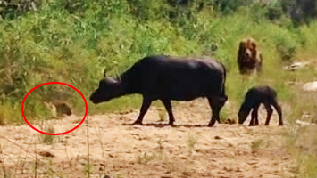 Unfortunately, while she was busy trying to locate the potential threat, a male lion appeared in the distance, closing in on the pair. Suddenly the buffalo were facing attack from two directions, and the mother would have to protect her calf alone.