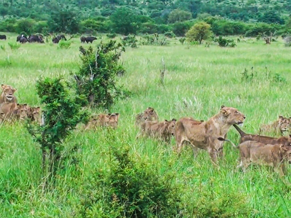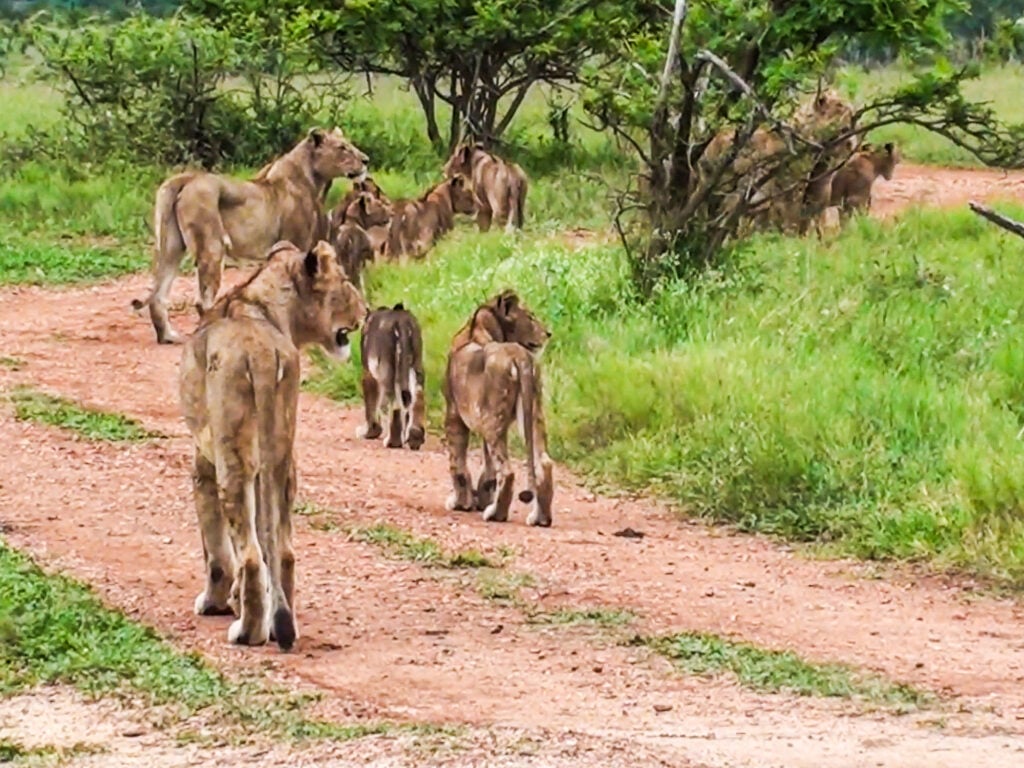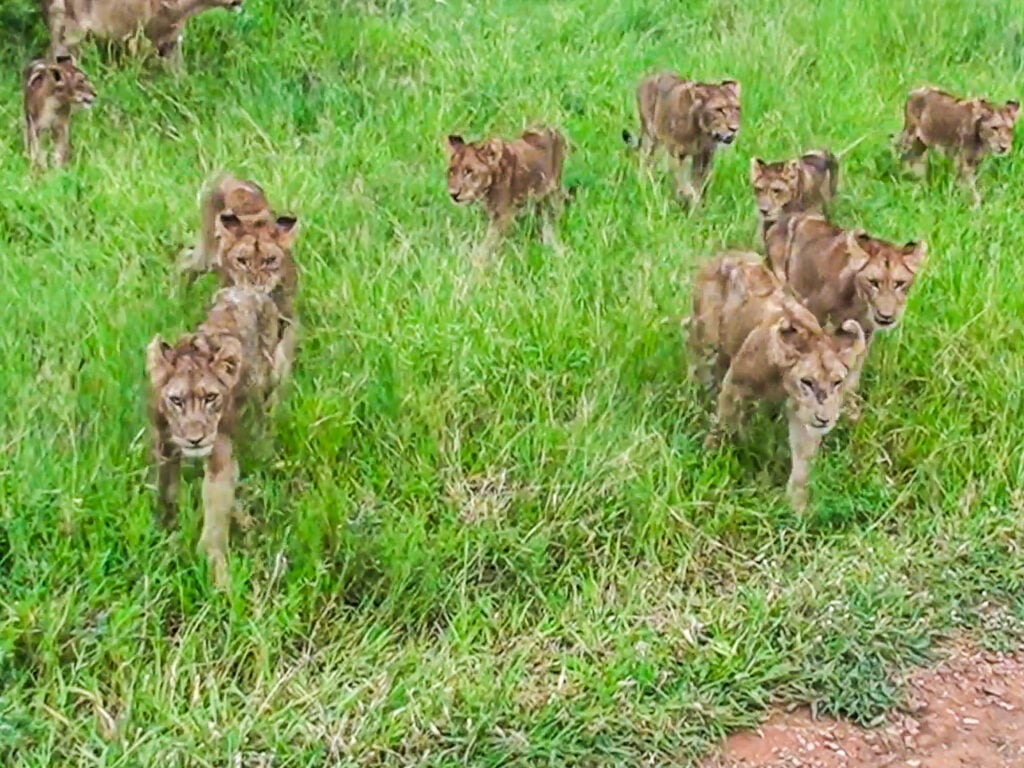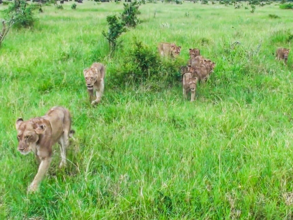 As we join the action in Dave’s video, we see a large pride of lions walking through the long green grass. The pride consists of several lionesses accompanied by lots of half-grown cubs.