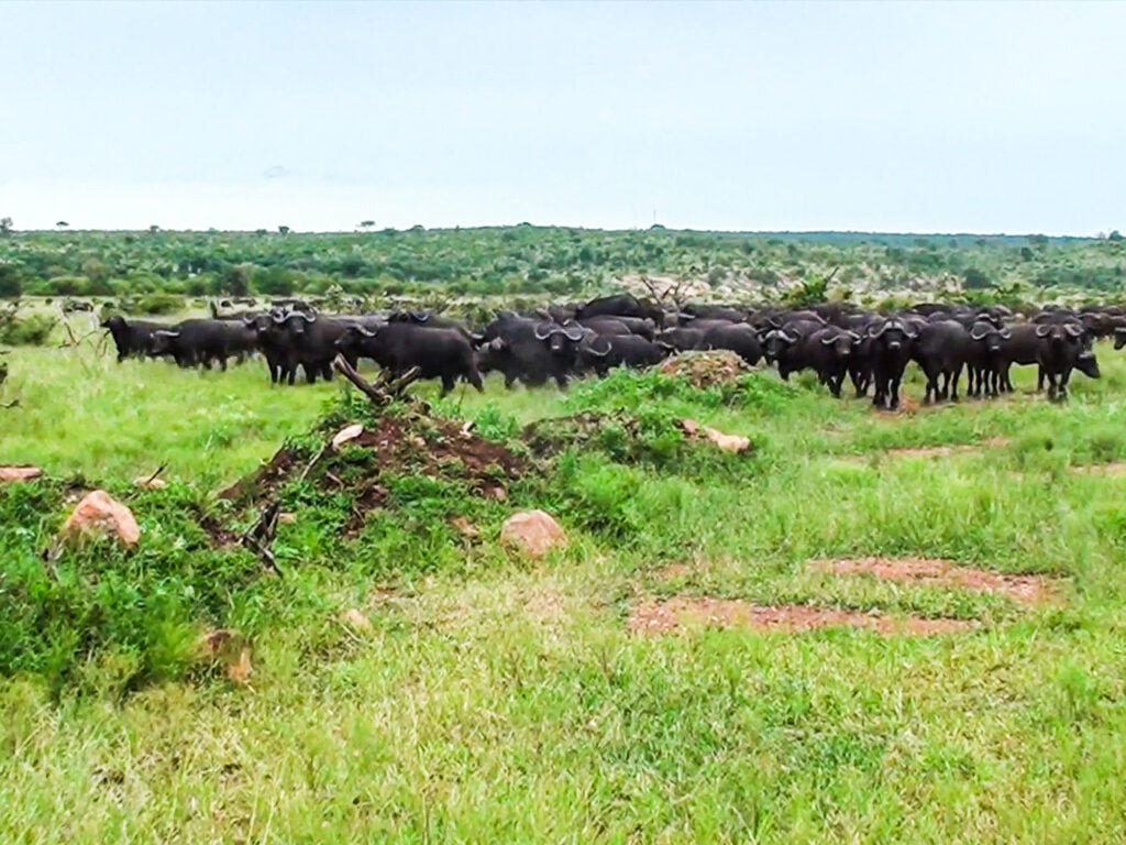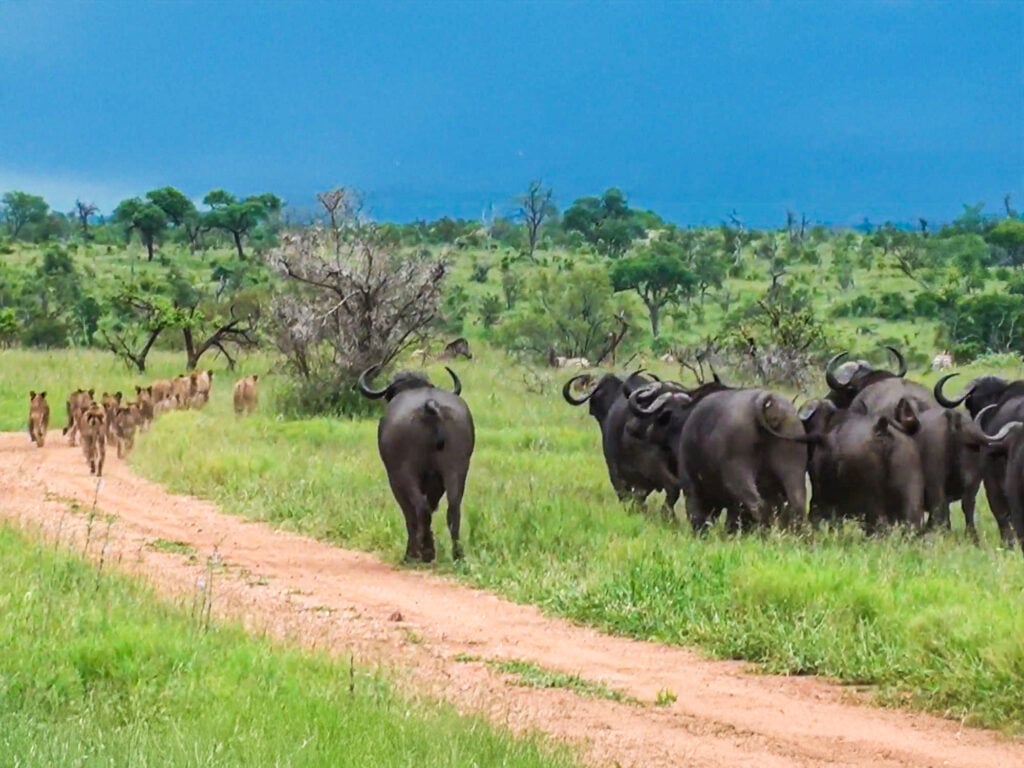 In the background, a herd of buffalo grazes peacefully, seemingly unaware of the lion’s presence. Judging by the lions’ direction of travel, they would have walked right past the buffalo.