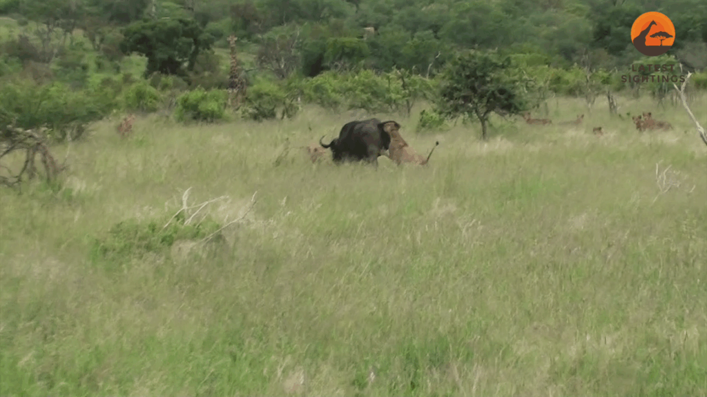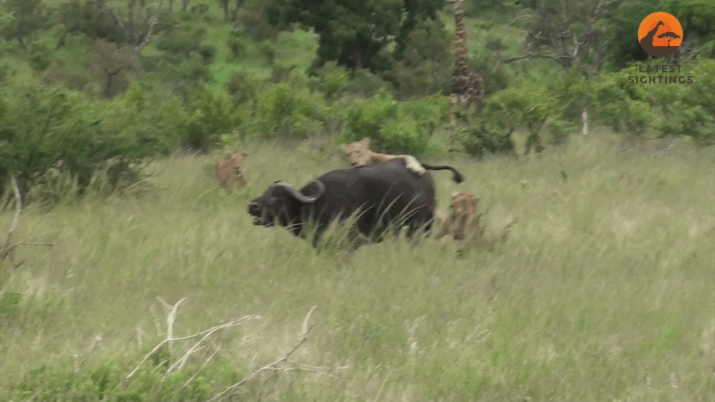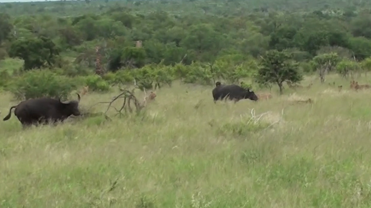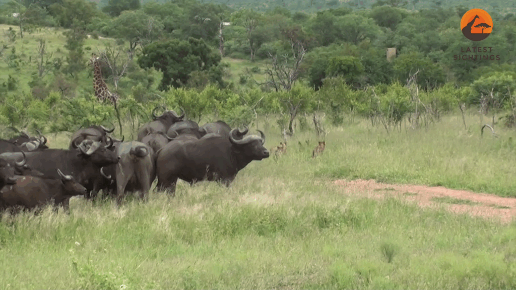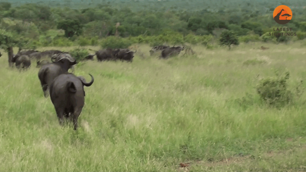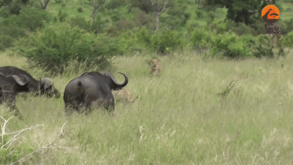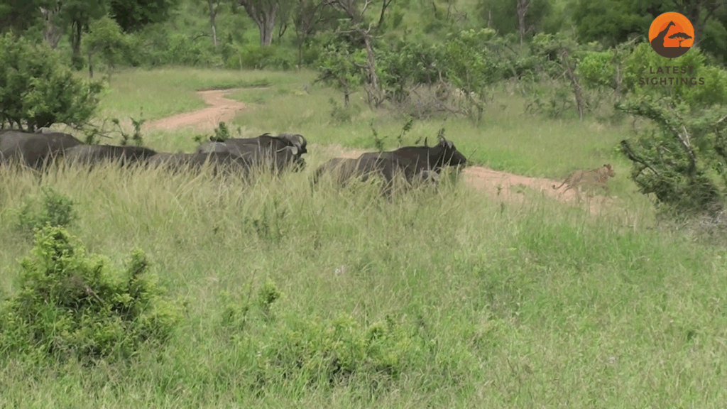 Subsequently, the lions decide to leave the road and head into the long grass. Still, the buffalo are determined to see them off and follow.
