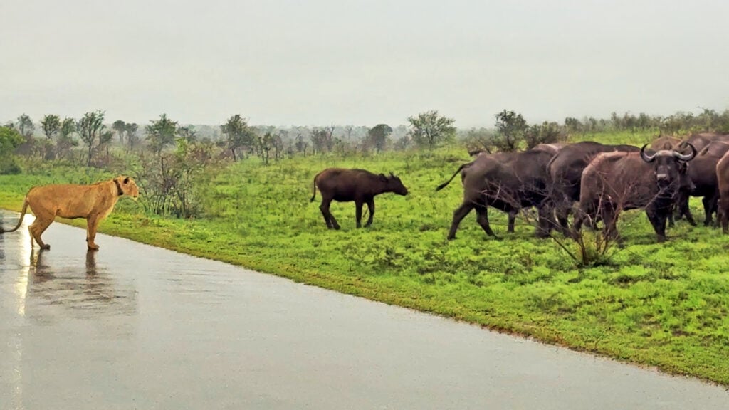 A lioness stood on the road ahead, calm, focused, and staring unwaveringly at a slowly advancing buffalo herd. Something about the scene felt off, however.