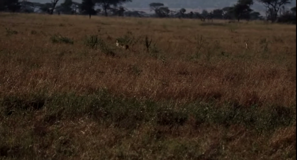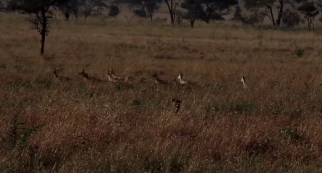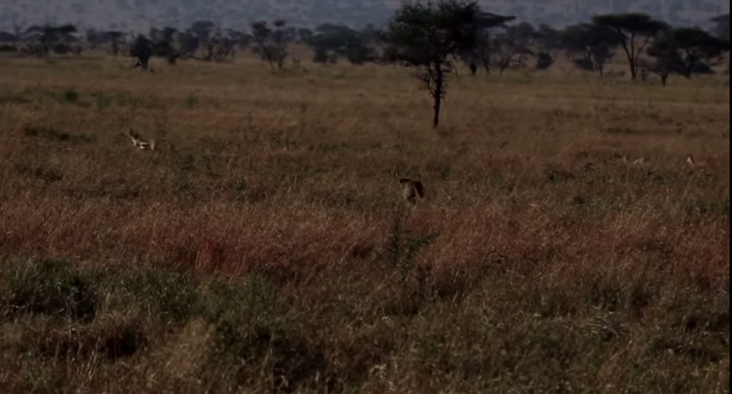 Serengeti is home to two species, namely Thomson’s and Grant’s gazelle. They are a favoured prey of many predators, one of which is stalking closer through the long grass.