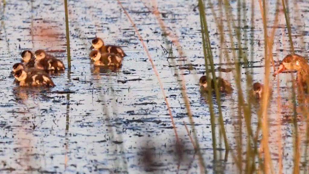 This patch of water was clearly home to several different kinds of aquatic fowl. Before the coots arrived on the scene, the footage showed a family of geese, complete with a mother and several tiny goslings.