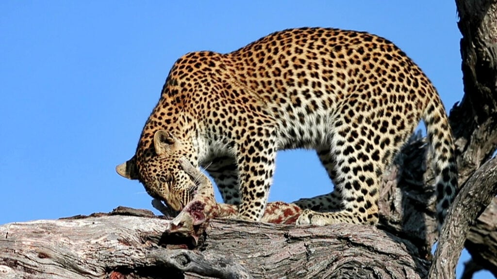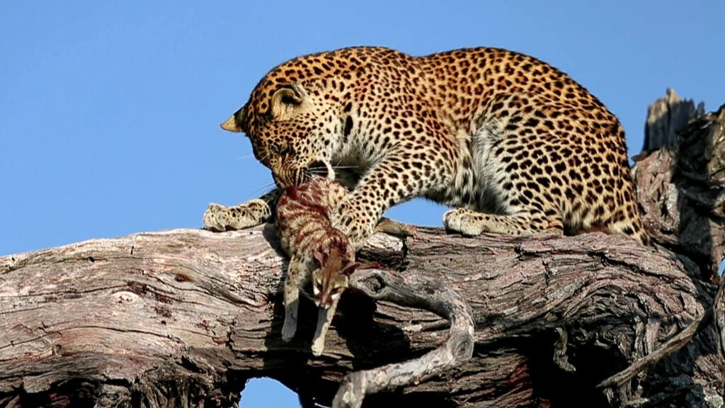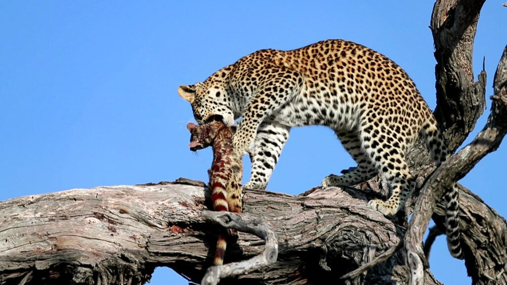 Leopard hoists dead genet into the branches of a tree