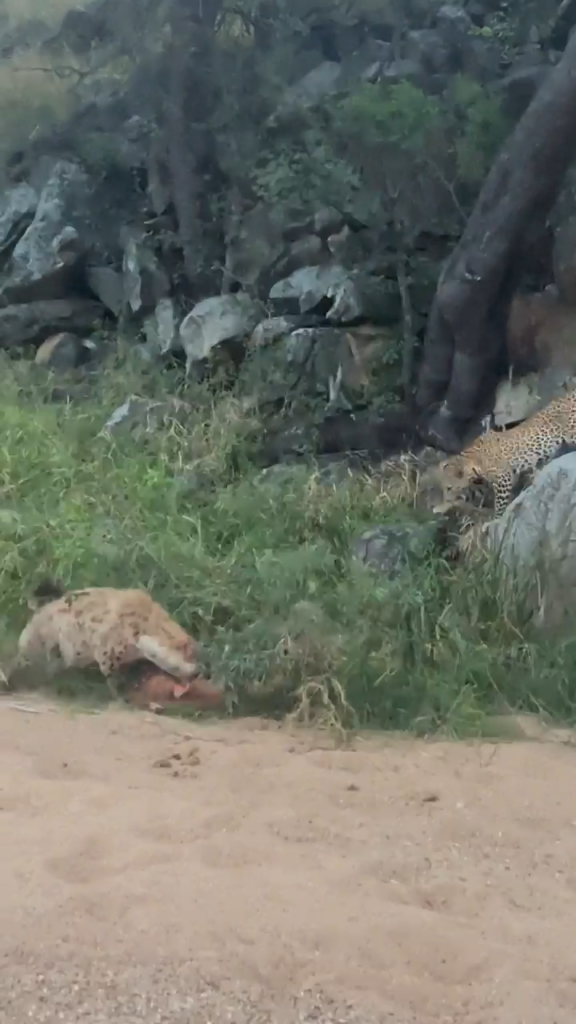It was unclear which of the animals was the most stubborn. The hyena was taking chances by staying in the leopard’s territory. The leopard, though having been chased off twice by the hyena now, refused to give up on the hope of a free meal.