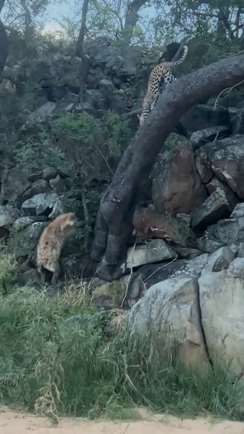 The hyena, which appeared to be the more aggressive of the two, chased the leopard up the tree, and the stealth predator watched as the hyena then began to feed on the impala carcass.