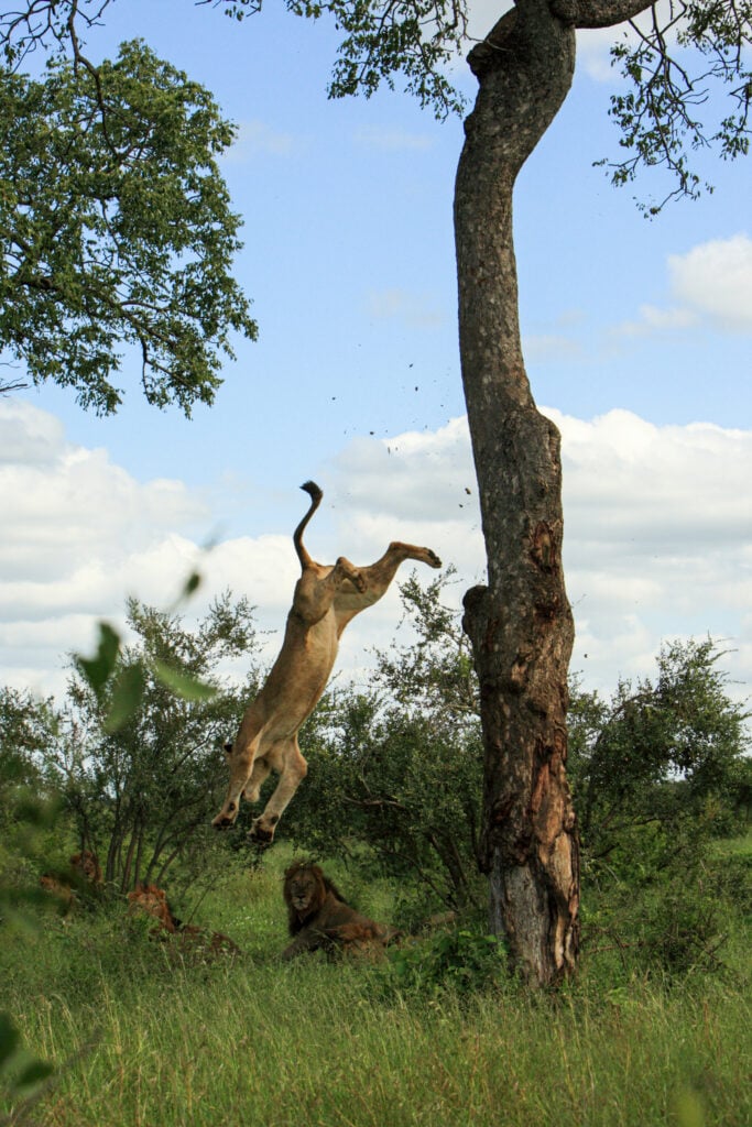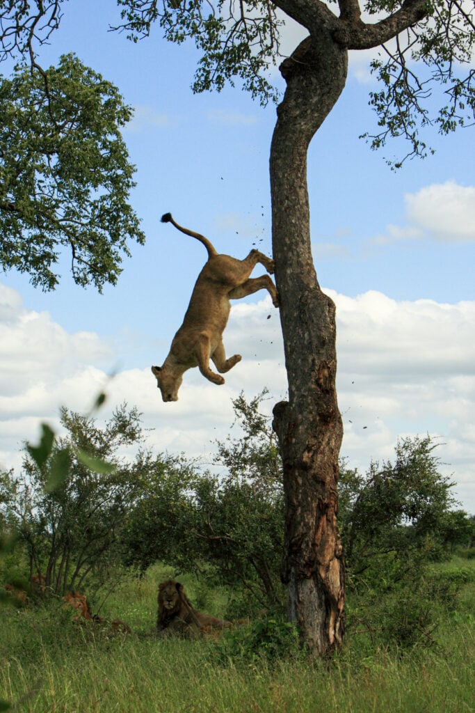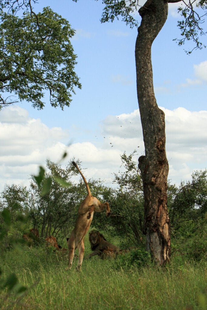 The lioness was in season and had climbed the tree in desperation to escape the male lions’ attention.