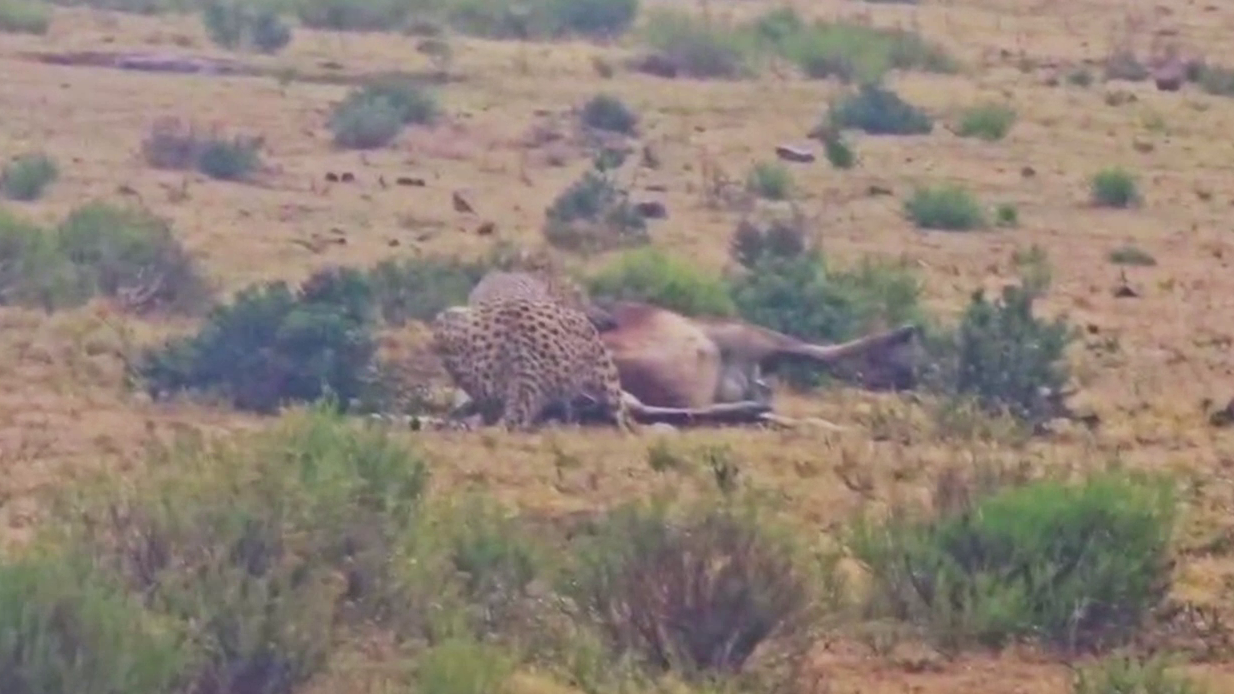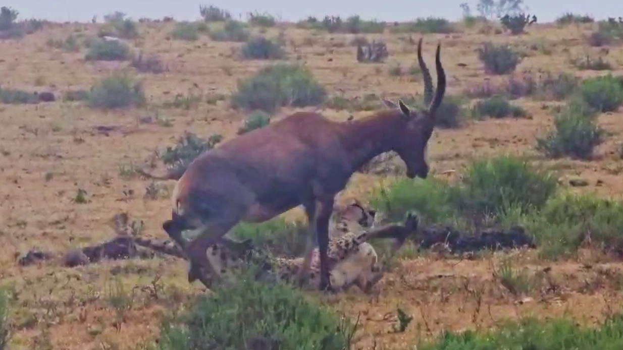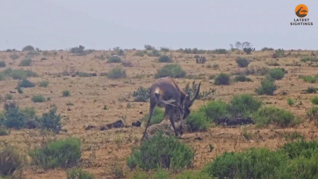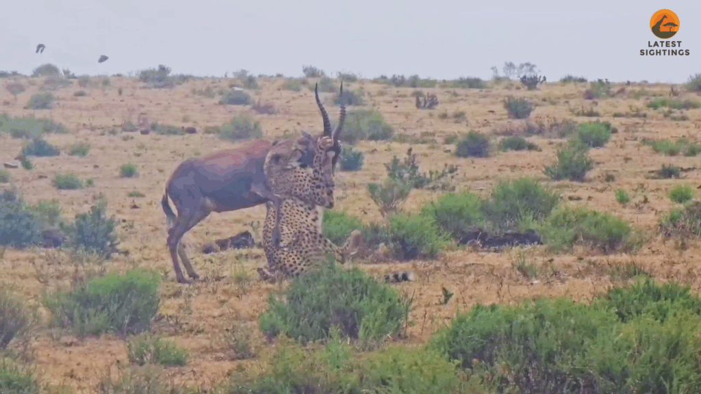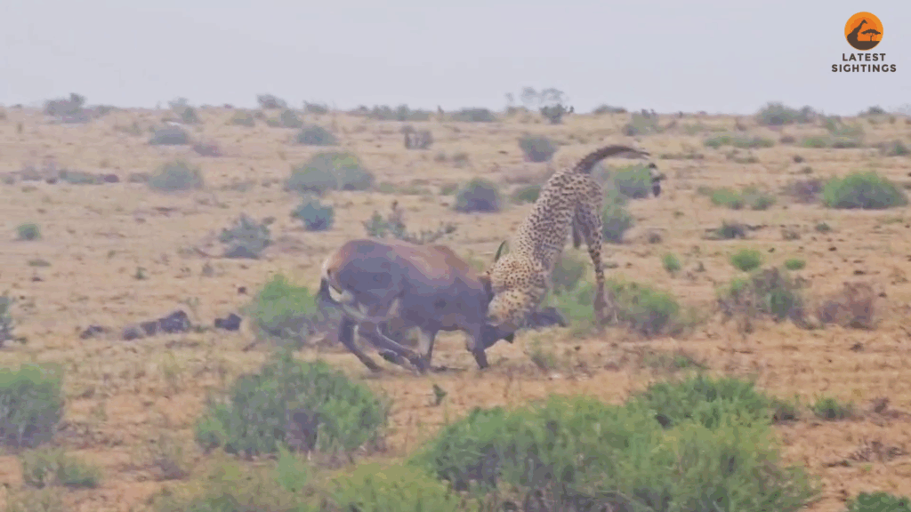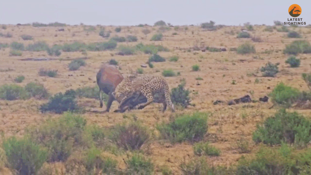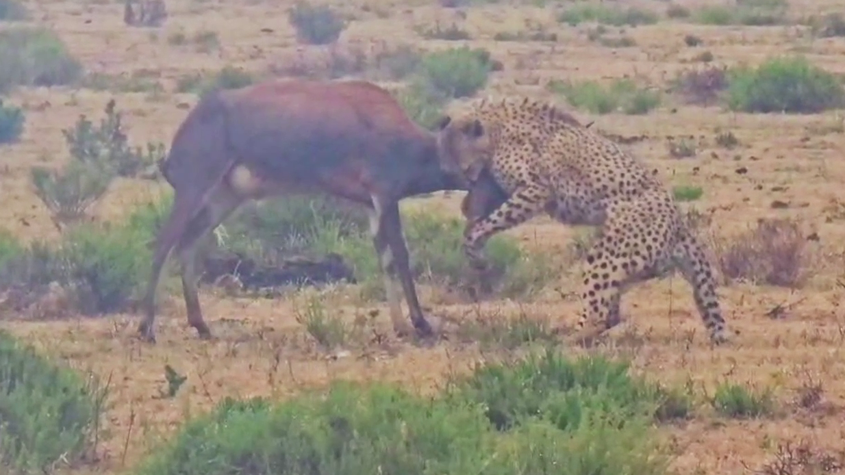 While the cheetah held on, the blesbok tried kicking the cat in the ribcage, but still it refused to let go.