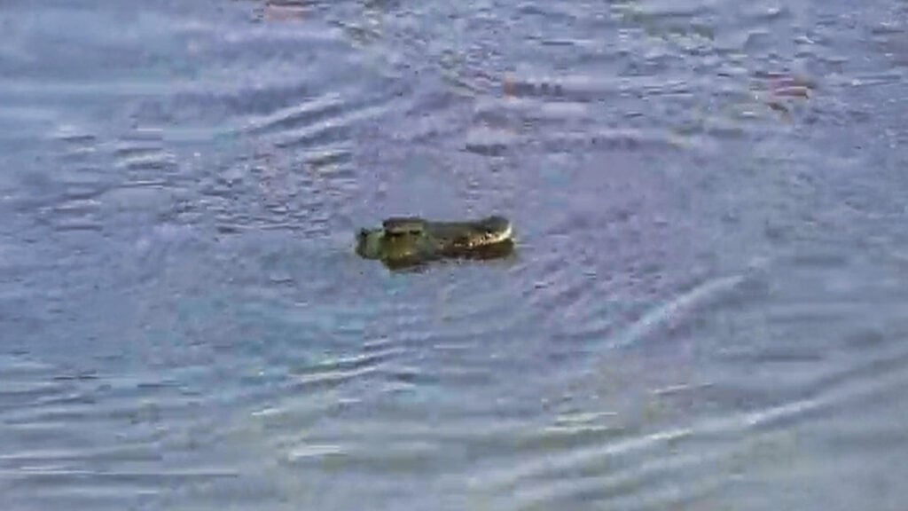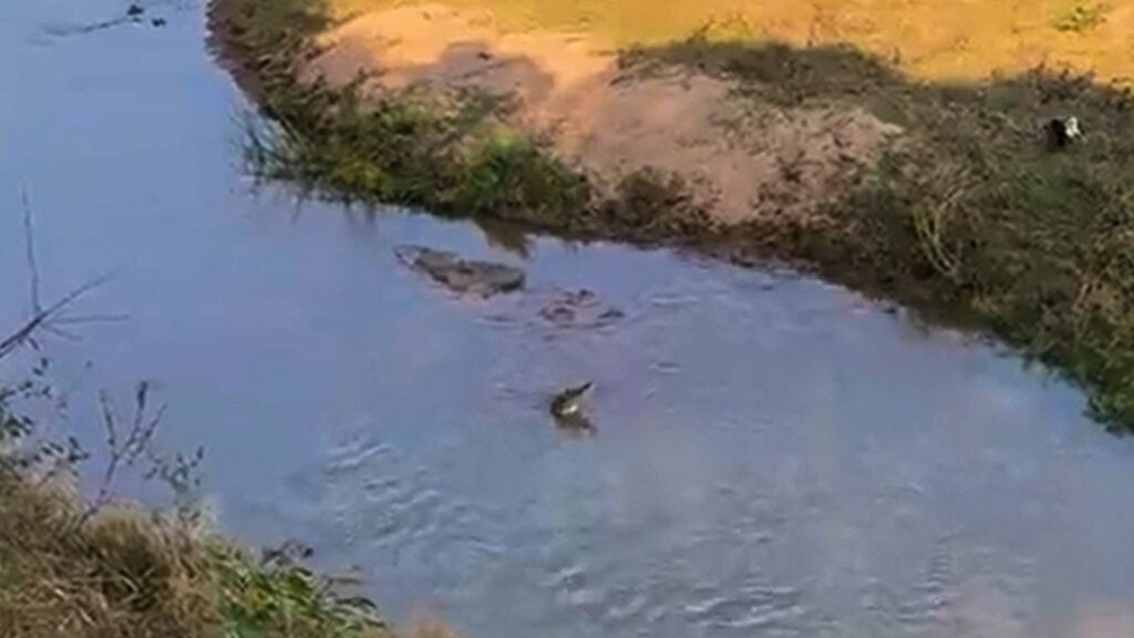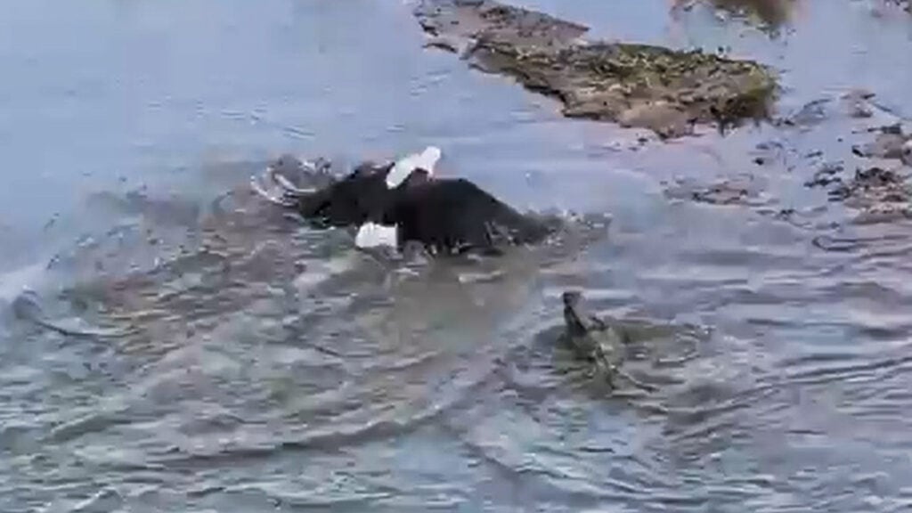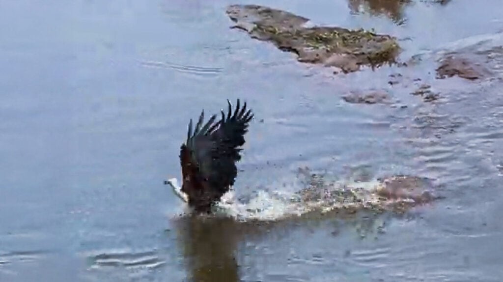 With perfect precision, it snatches something floating in the shallows right next to the crocodile’s head. For a moment, it seems the bird has pulled off a perfect heist, but the eagle’s prize is heavy, and instead of flying off into the distance, it awkwardly drags the catch toward the shoreline.