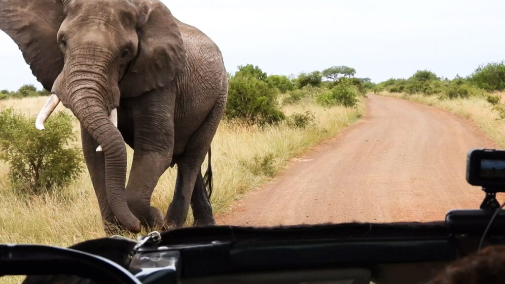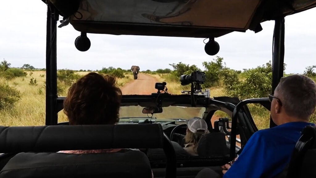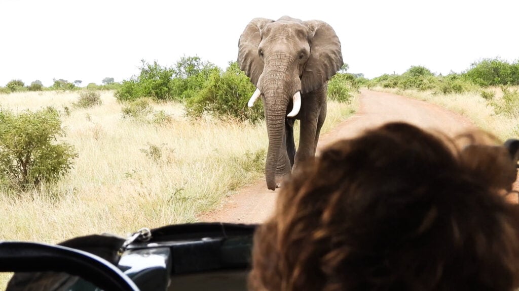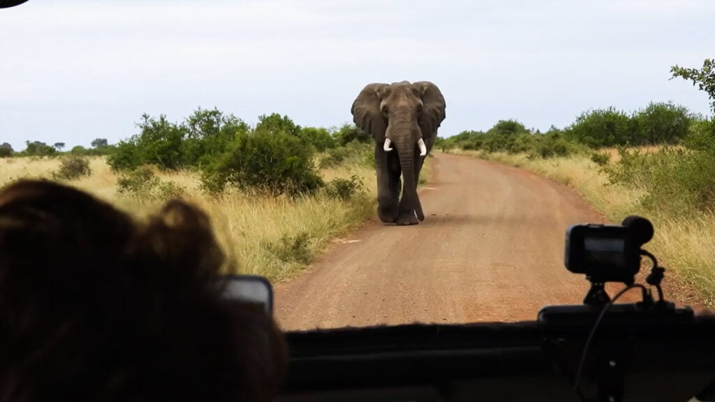 The video begins with a safari group parked on a dirt road, their vehicle sitting directly in the path of a lone elephant. Dust rose gently as the giant made its way down the track, with ears relaxed but its towering frame more than enough to make the guests’ hearts race.