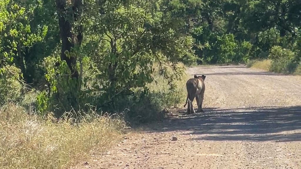The lionesses continued to make their way through the bush across the road, away from the elephant’s rampage.