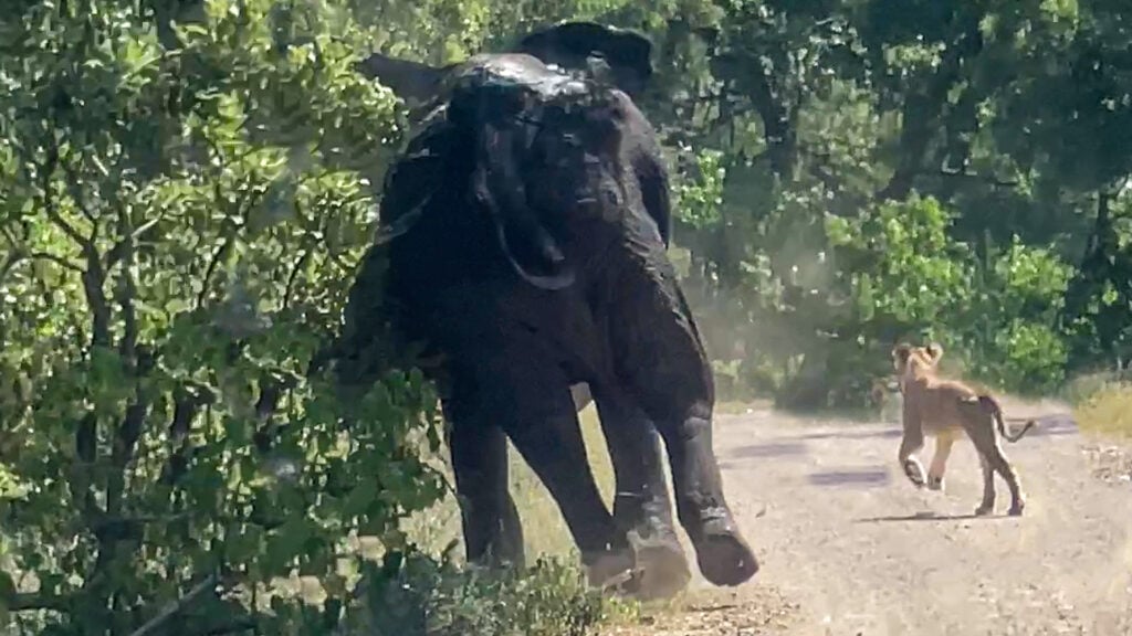 He charged towards the lionesses with a trumpet of fury, demonstrating great power and ethereal trumpeting ability. He broke through the bush in a moment, leaving the viewers behind the camera audibly gasping.