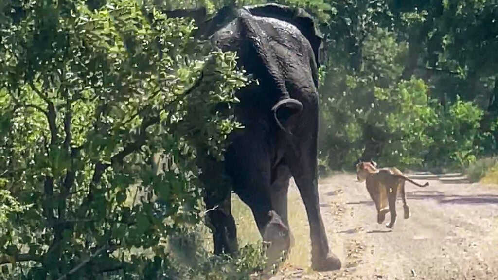 Ahead of his, the lionesses scattered, as taken by surprise by the elephant’s sudden charging behaviour as the spectators in the vehicle.