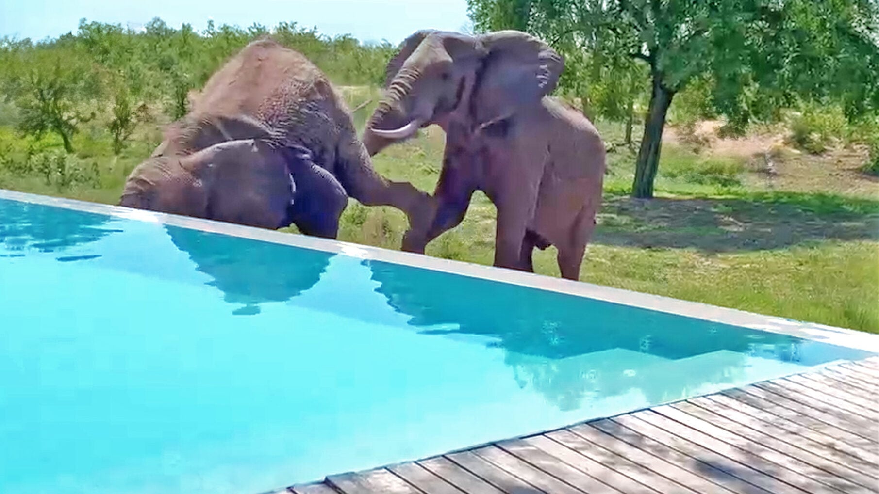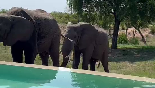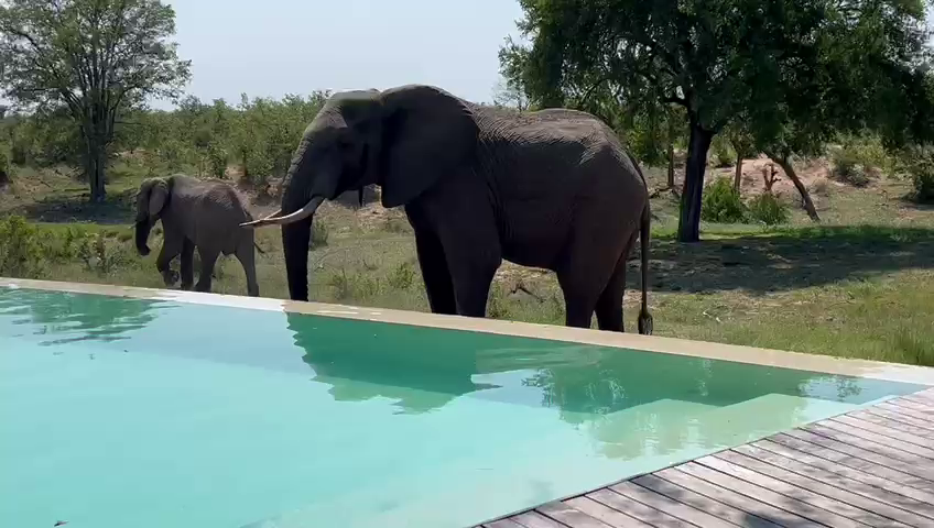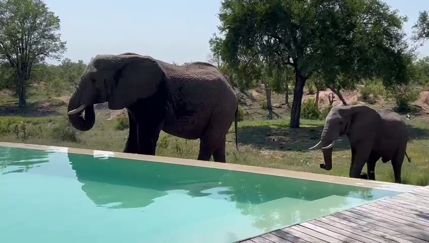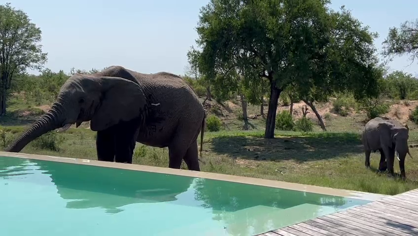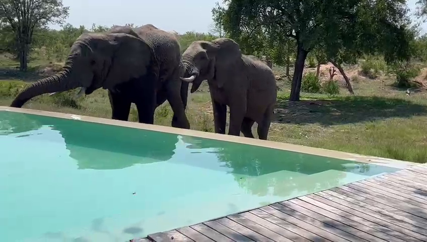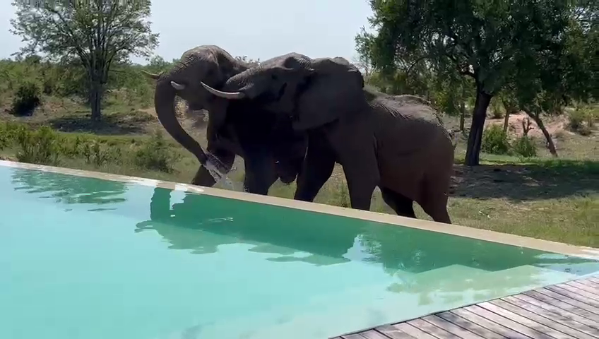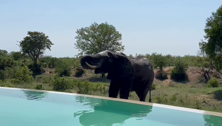 We are met with a peaceful, if unusual, scene at the start of the video. An elephant bull is enjoying a refreshing drink from a lodge swimming pool.