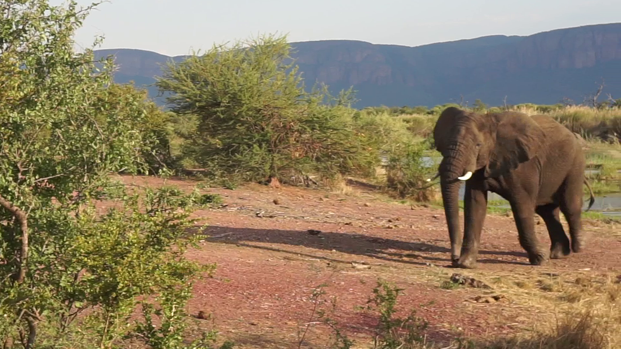 As he walks in the lion’s footsteps, you’ll note that the tip of his trunk is held low to the ground. To compensate for their short-sightedness, elephants have a phenomenal sense of smell. So, he is following the scent trail the lion left behind.
