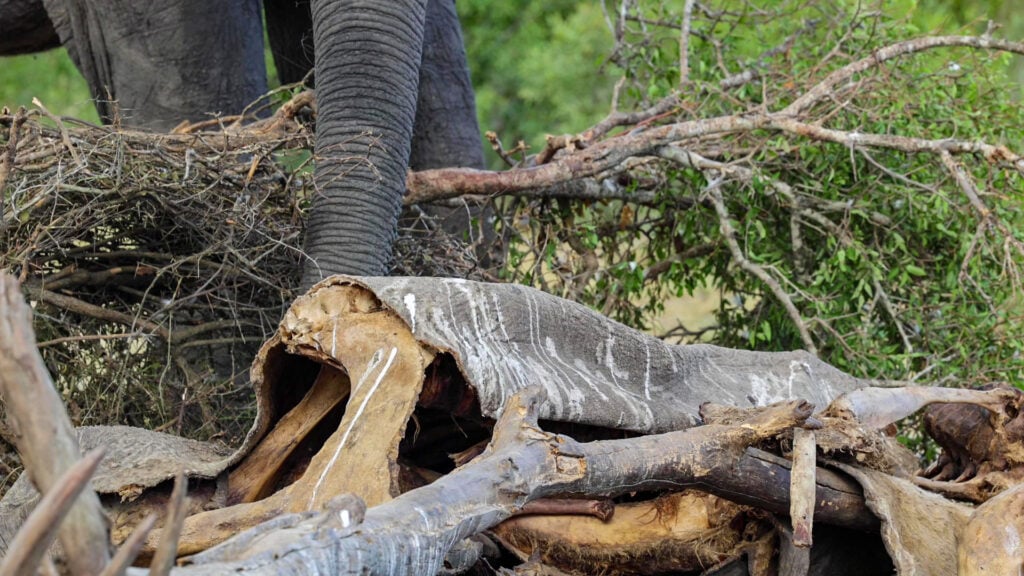 Elephant uses trunk to investigate carcass