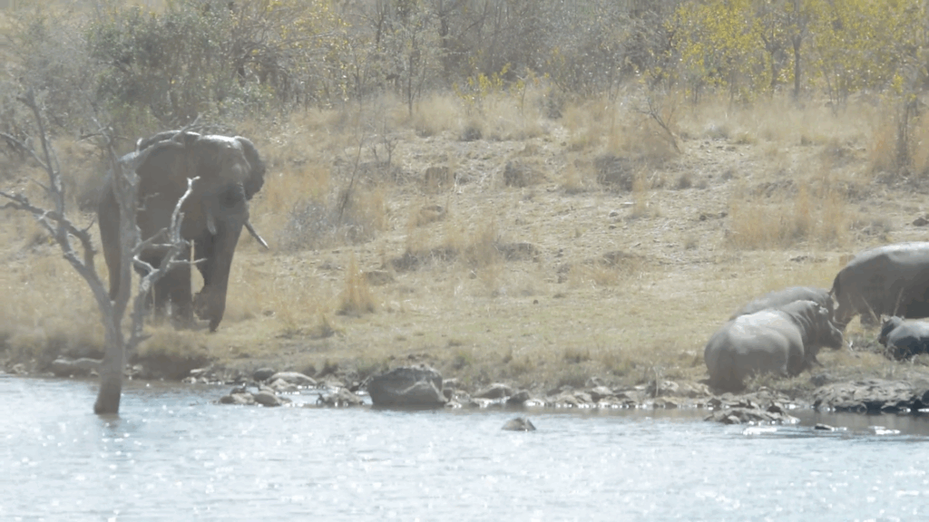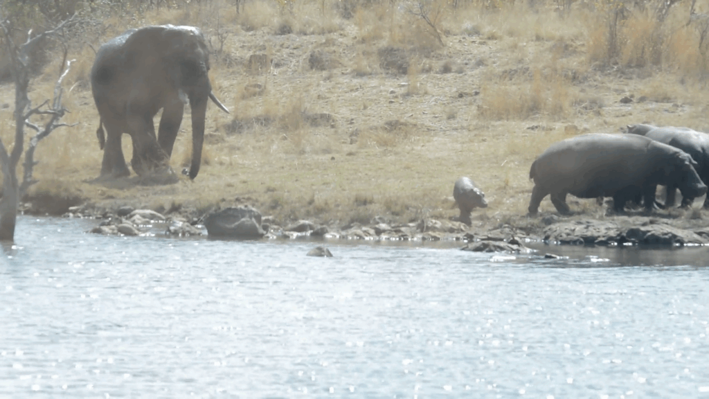 Ravi Charan captured this elephant as it crossed the entire dam just to force these relaxed hippos back into the water, and sent the footage in to Latest Sightings.
