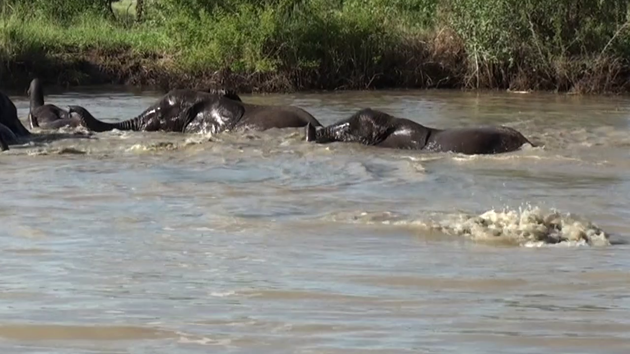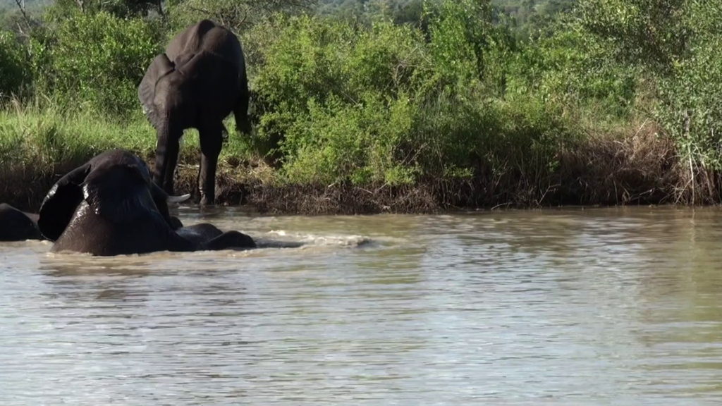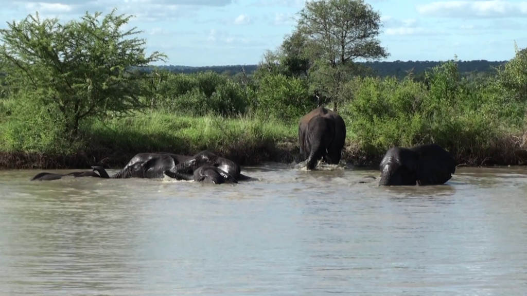 As the video begins, we see a small herd of elephants at a waterhole. Only, they’ve not come to drink. They’ve come for a refreshing swim.