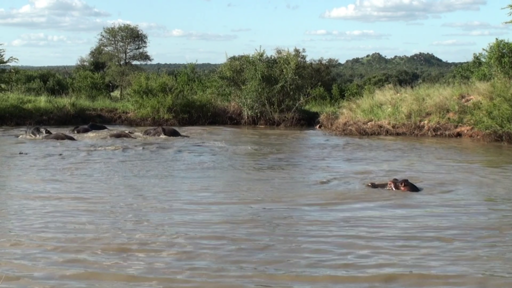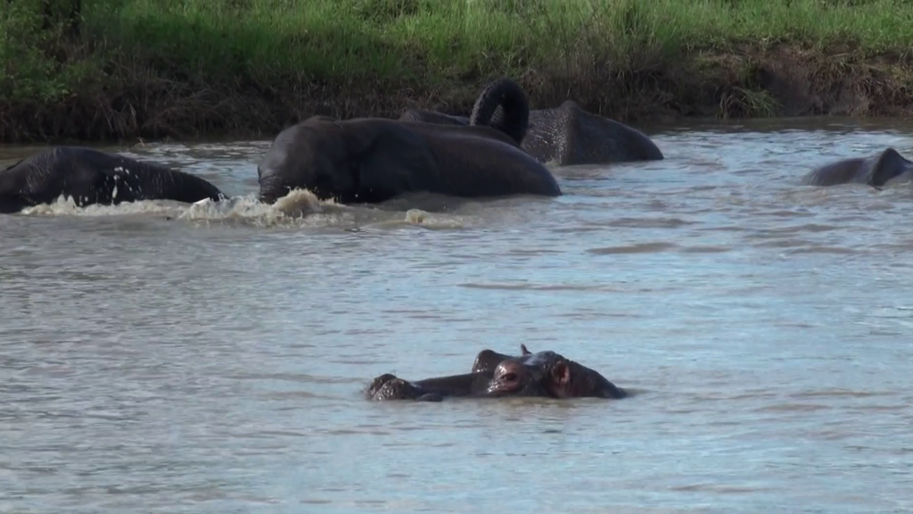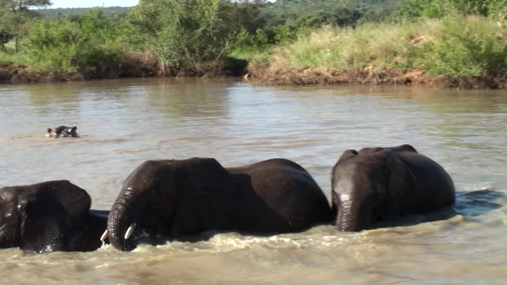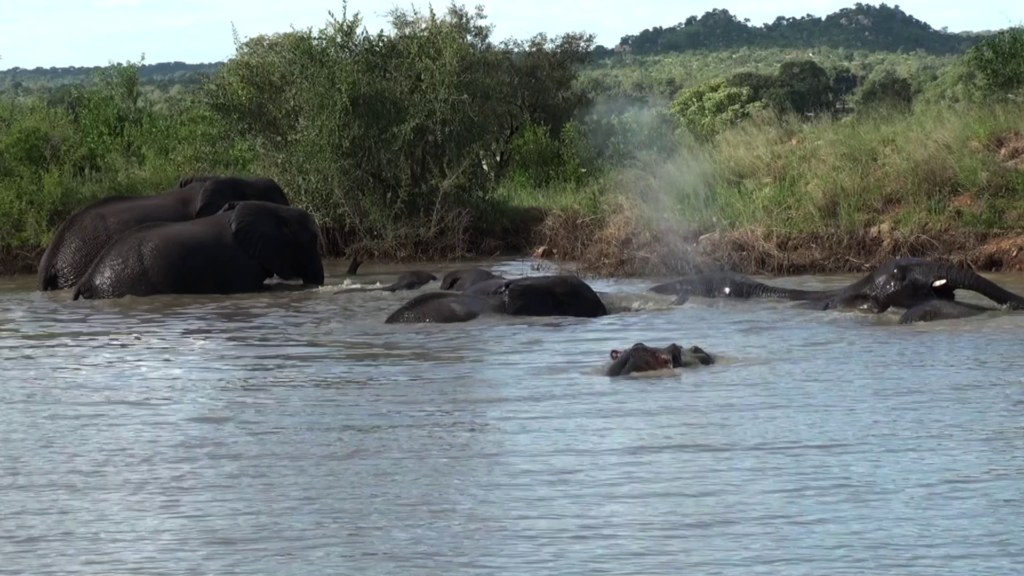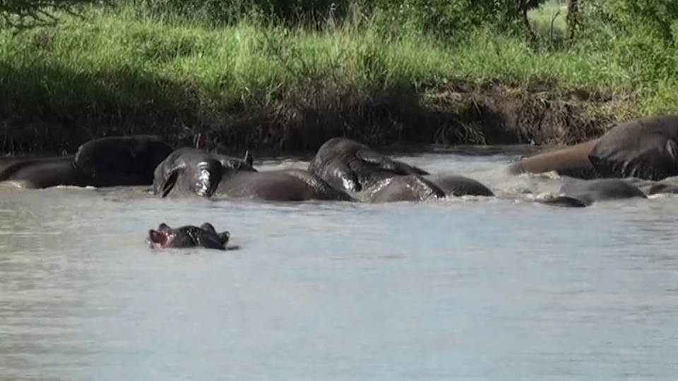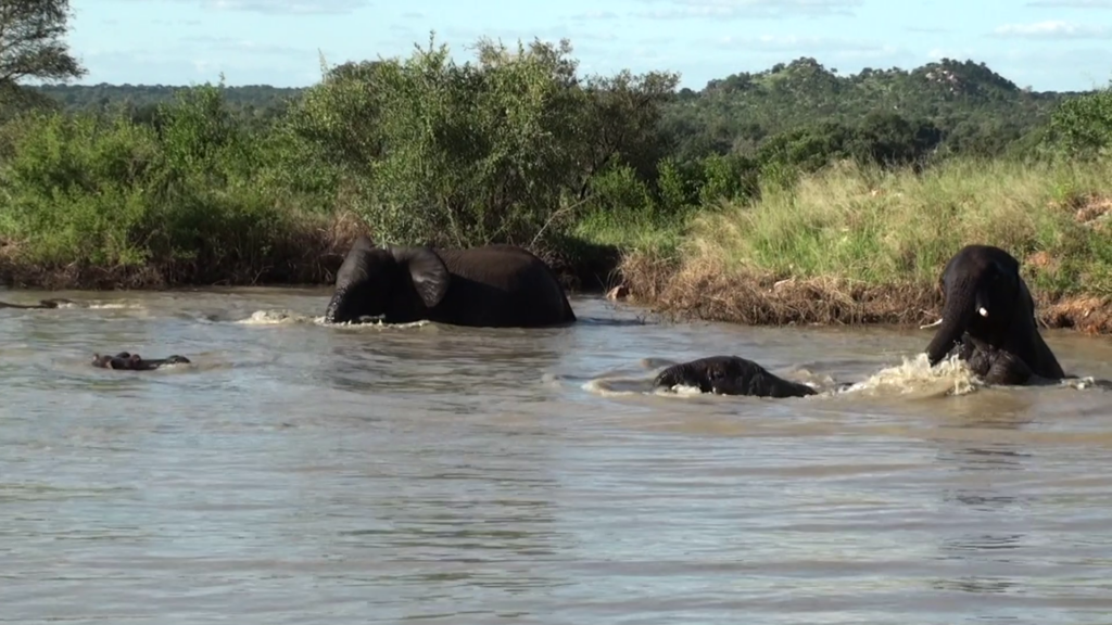 Subsequently, the hippo resurfaces. He seems to know that things won’t go well for him if he’s aggressive towards the elephants.
