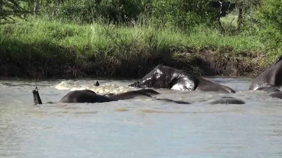 Having seen the source of the disturbance, the hippo submerges. Indeed, even some of the elephants are fully submerged too.