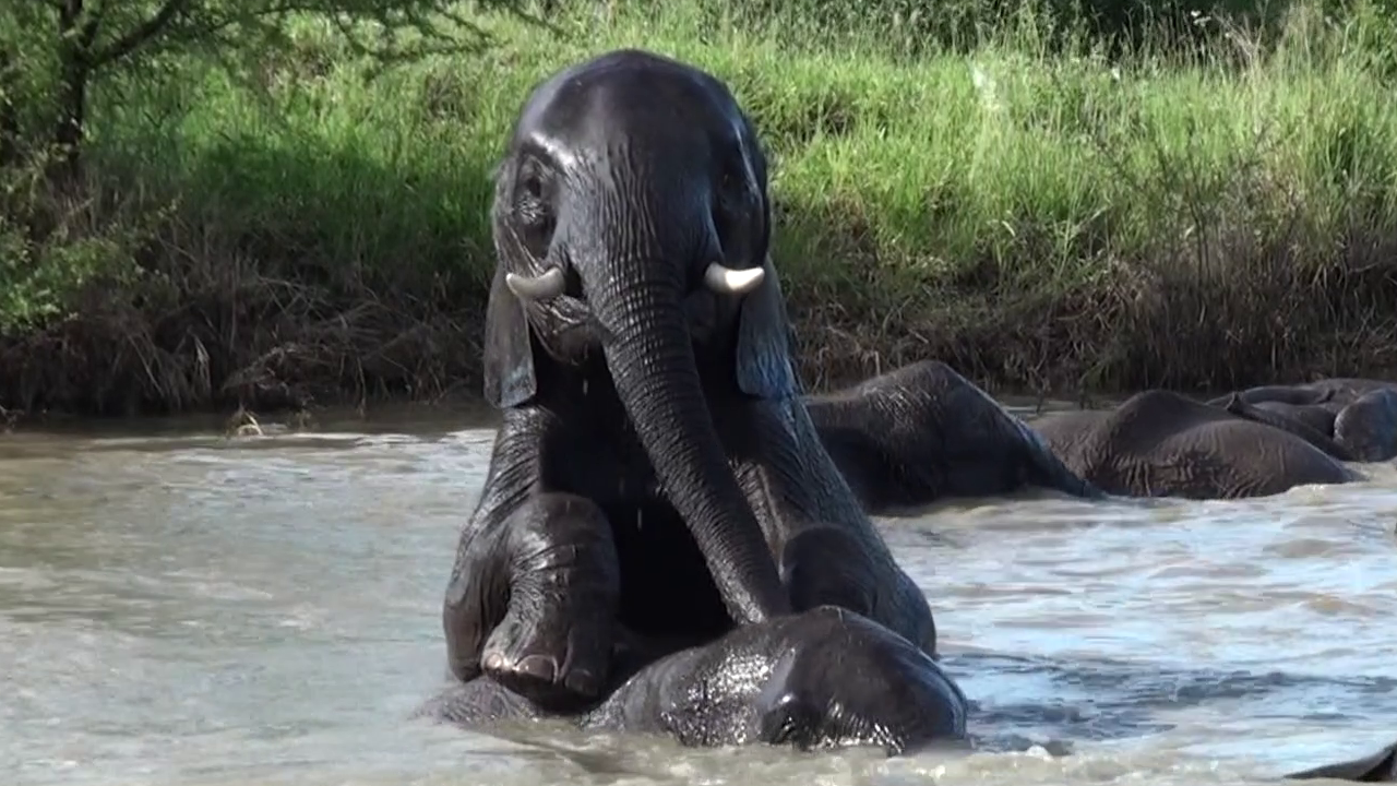 Instead, it is playful aggression aimed at establishing dominance. Most of the elephants are teenagers, as seen by their short tusks.