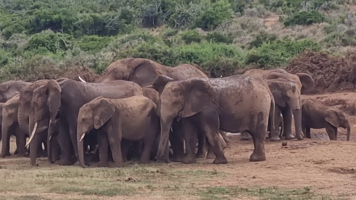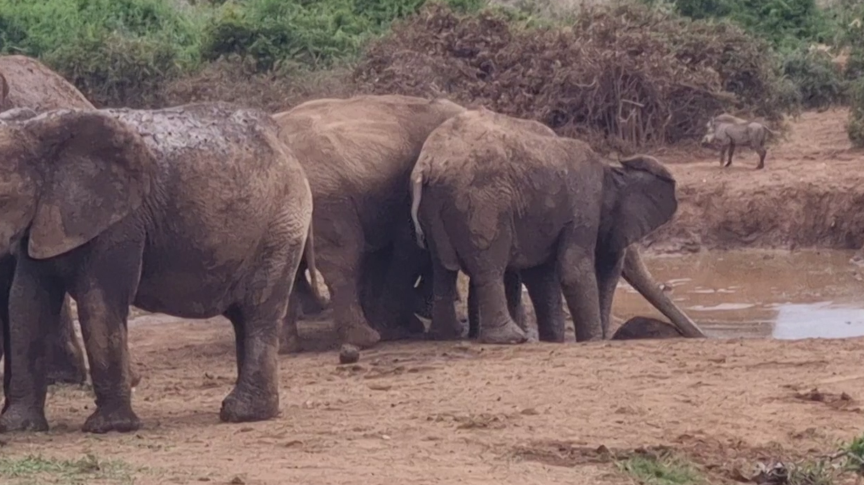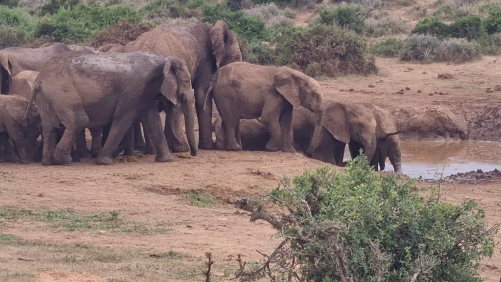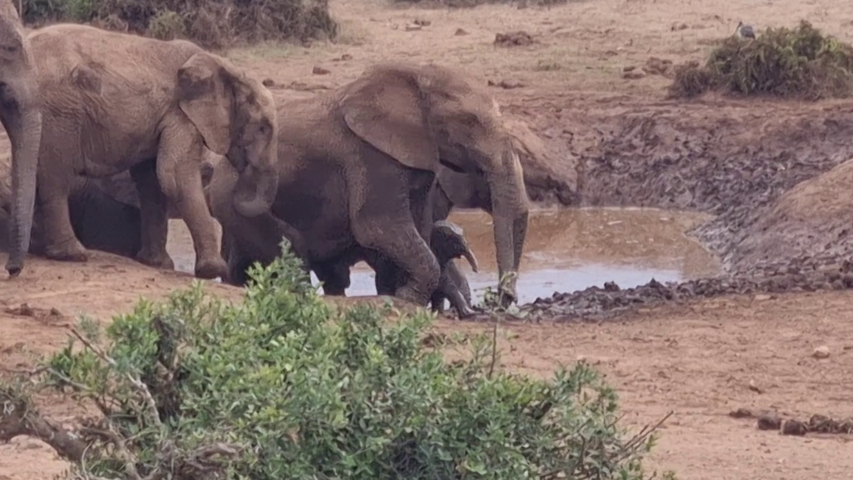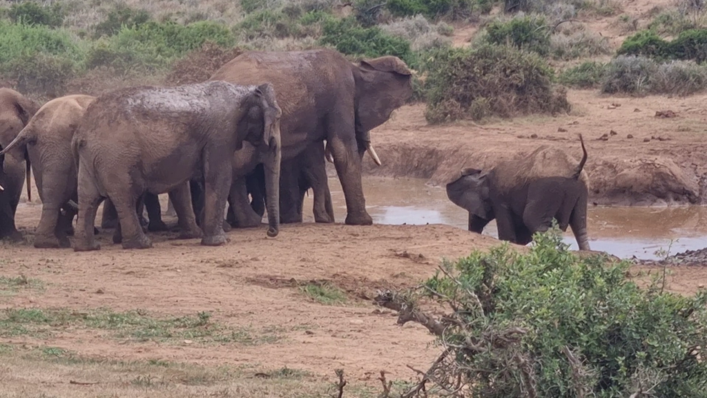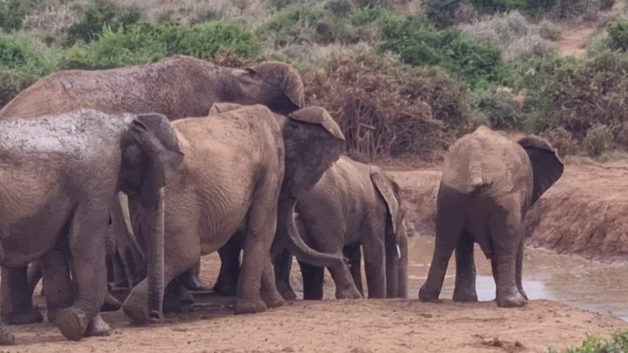 Jolandi’s video begins peacefully enough. A large herd of elephants gathers at a sunken waterhole. Most have already drunk their fill, so they bunch tightly together while waiting to move on.