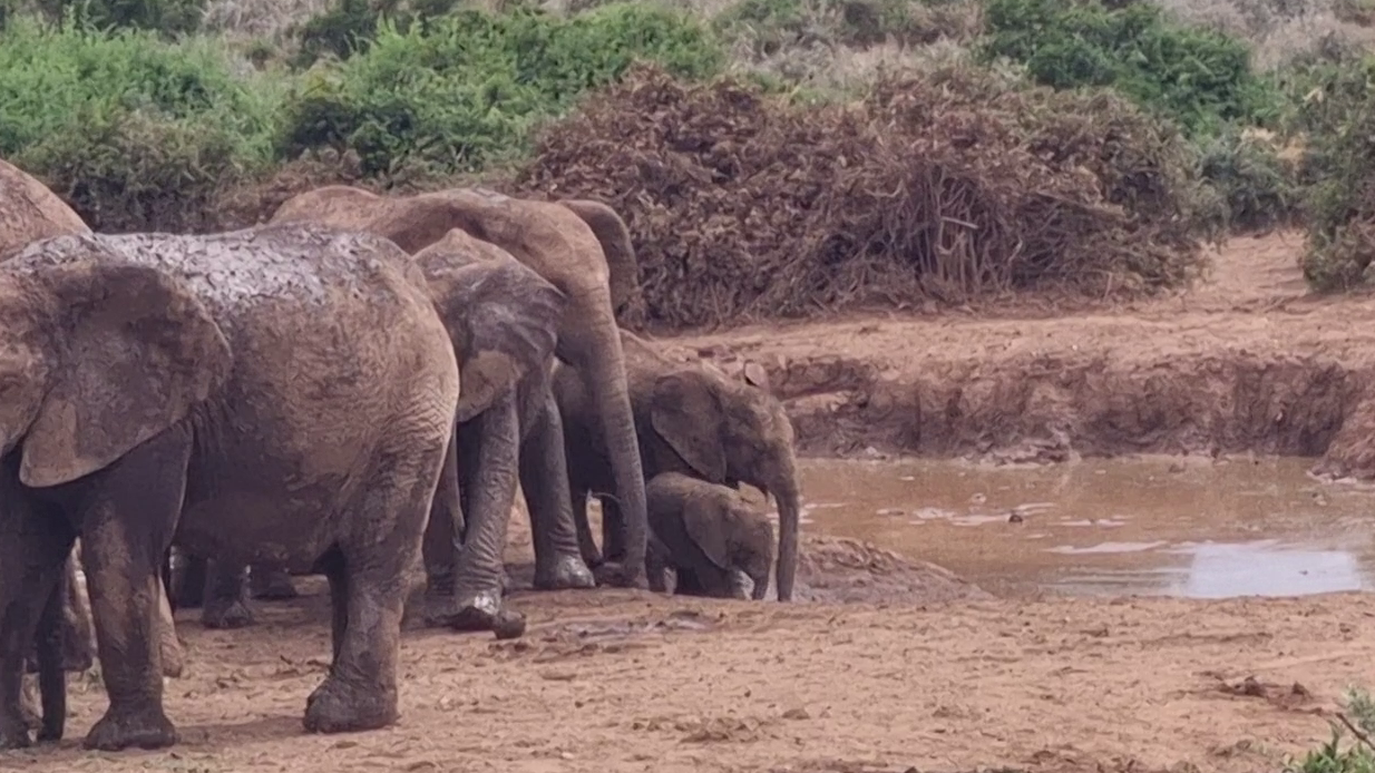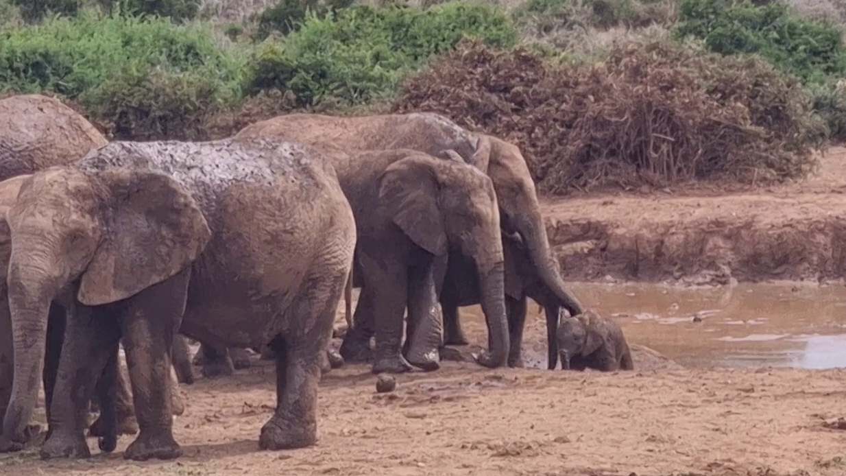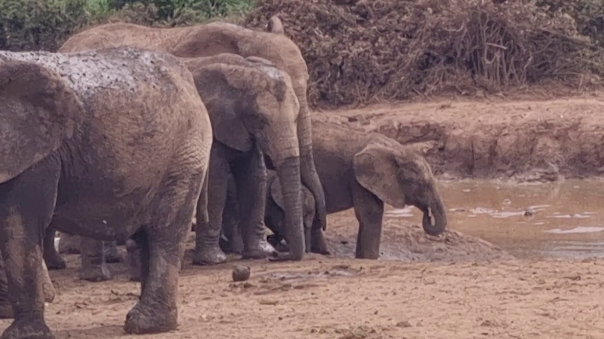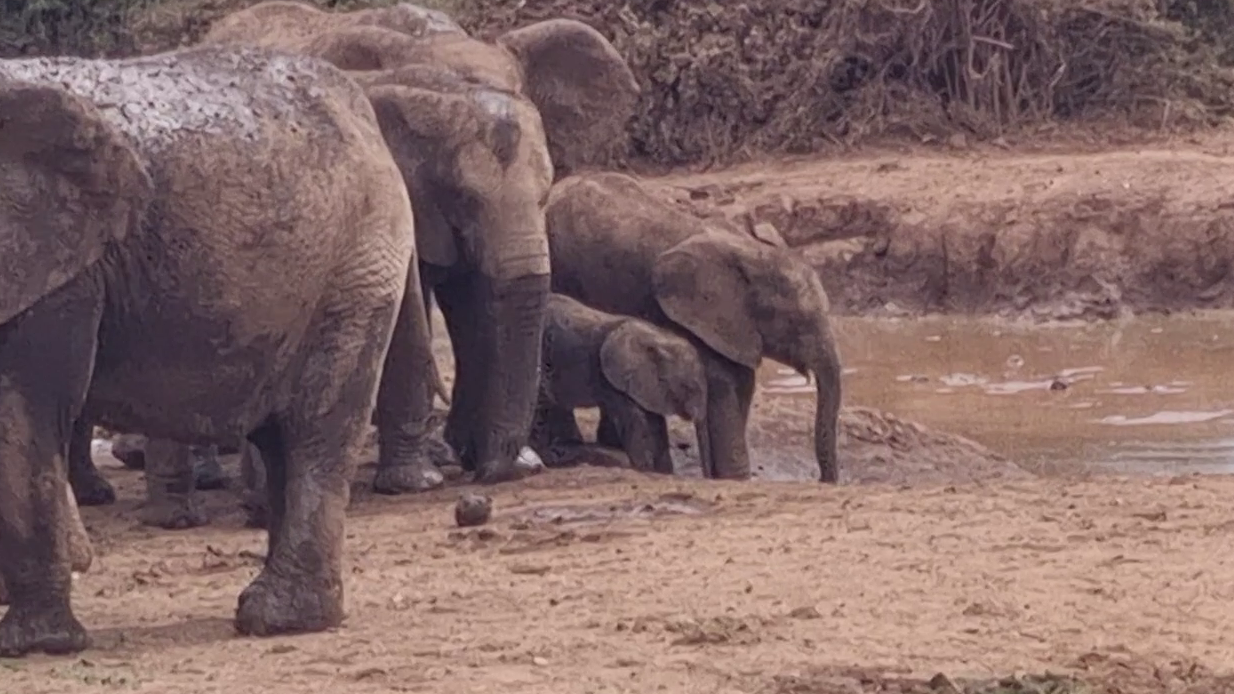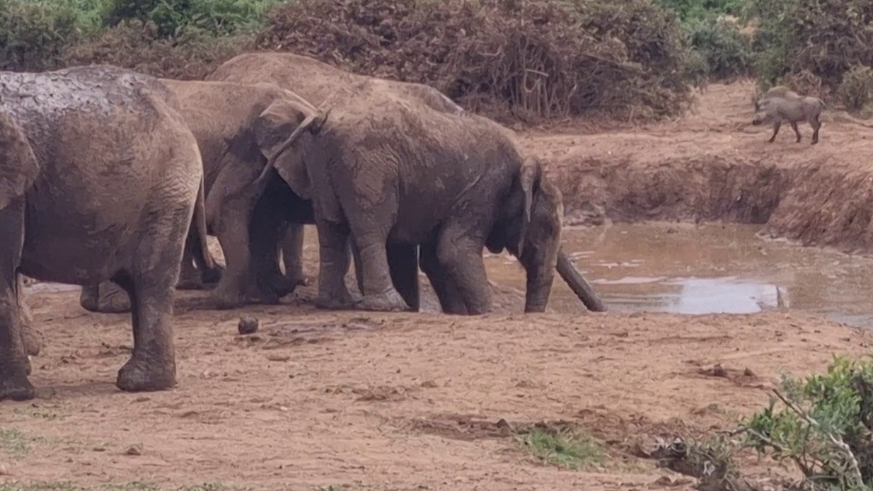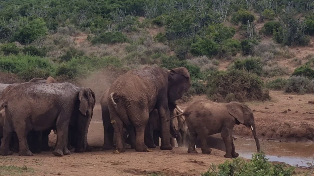 Jolandi’s video begins peacefully enough. A large herd of elephants gathers at a sunken waterhole. Most have already drunk their fill, so they bunch tightly together while waiting to move on.