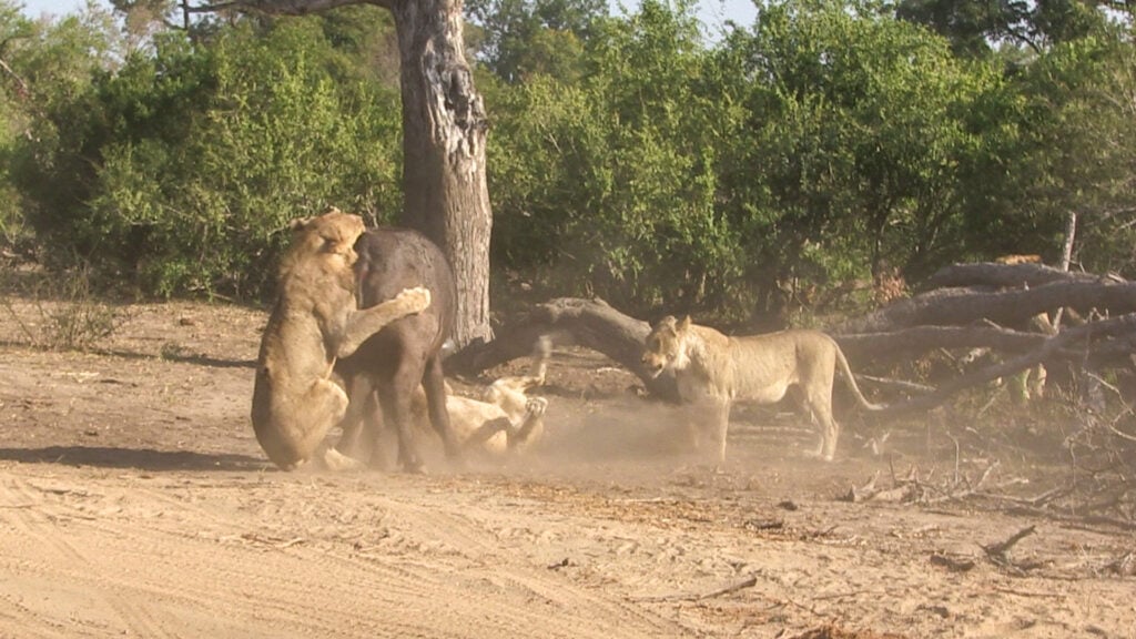 It managed to keep itself just out of harms way by clinging to its prey’s face, but this was hardly the effective hunting display one might expect to see from a trio of lions.