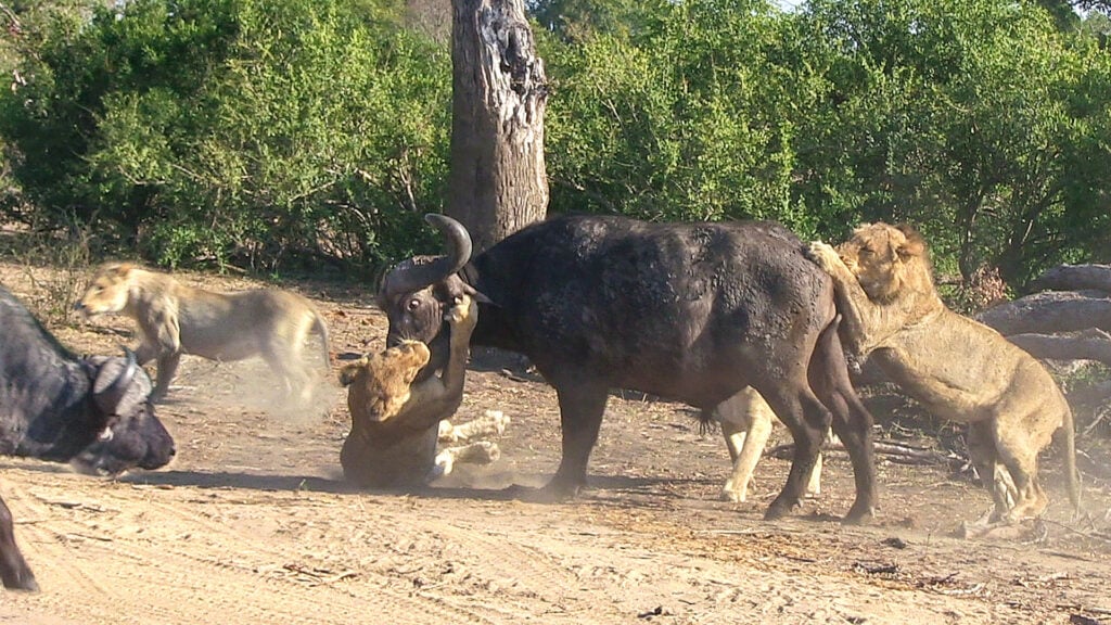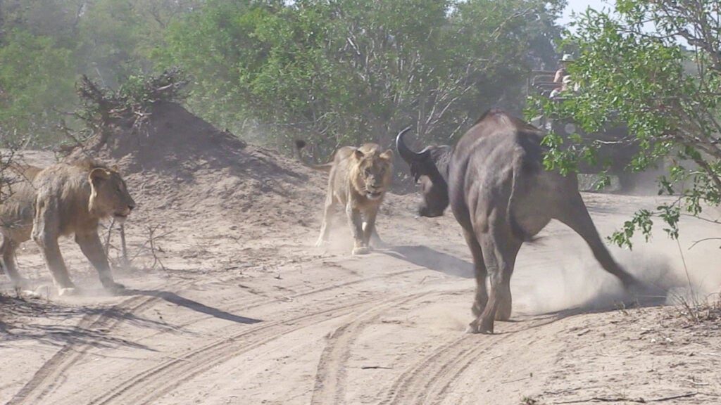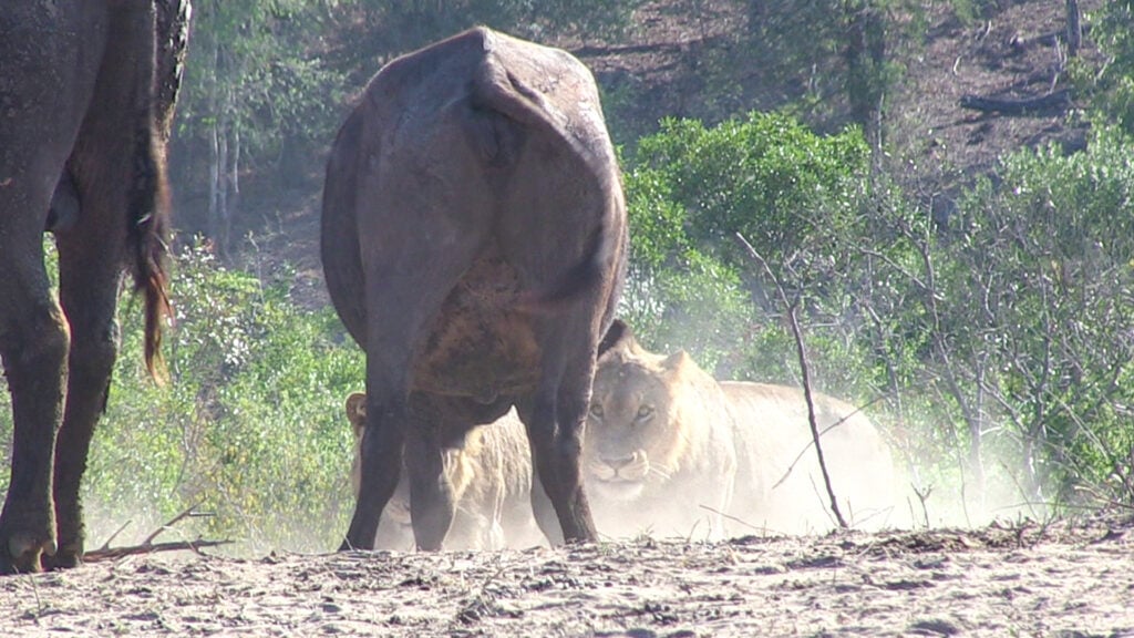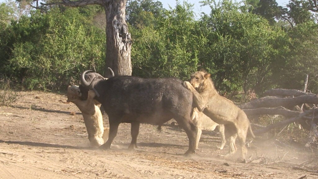 This buffalo was in a fight for its life, and it wasn’t about to let the lions get an easy kill. The lion at the rear had its claws lodged in the buffalo’s rump but this alone wouldn’t bring it down.