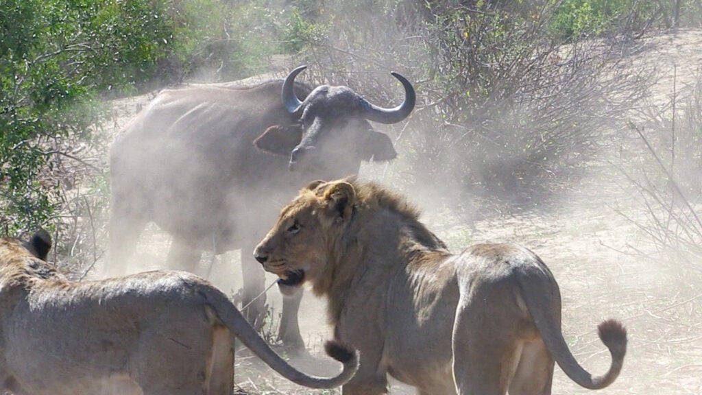 Whichever one of these three lions designated this buffalo as a target was guilty of some severe miscalculations. Not only was this buffalo about to put up an impressive fight, it turned out it wasn’t as vulnerable as the lions might have thought.